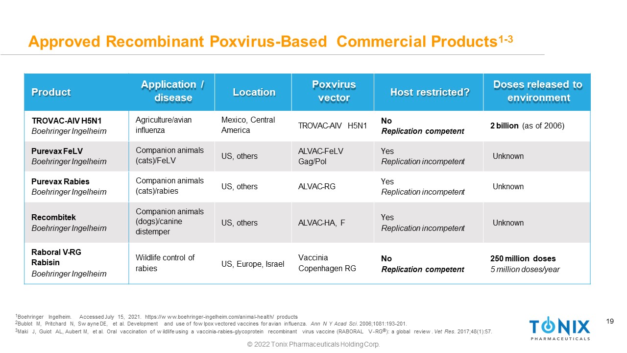 19 Approved Recombinant Poxvirus - Based Commercial Products 1 - 3 Product Application / disease Location Poxvirus vector Host restricted? Doses released to environment TROVAC - AIV H5N1 Boehringer Ingelheim Agriculture/avian influenza Mexico, Central America TROVAC - AIV H5N1 No Replication competent 2 billion (as of 2006) Purevax FeLV Boehringer Ingelheim Companion animals (cats)/FeLV US, others ALVAC - FeLV Gag/Pol Yes Replication incompetent Unknown Purevax Rabies Boehringer Ingelheim Companion animals (cats)/rabies US, others ALVAC - RG Yes Replication incompetent Unknown Recombitek Boehringer Ingelheim Companion animals (dogs)/canine distemper US, others ALVAC - HA, F Yes Replication incompetent Unknown Raboral V - RG Rabisin Boehringer Ingelheim Wildlife control of rabies US, Europe, Israel Vaccinia Copenhagen RG No Replication competent 250 million doses 5 million doses/year © 2022 Tonix Pharmaceuticals Holding Corp. 1 Boehringer Ingelheim. Accessed July 15, 2021. https://w ww.boehringer - ingelheim.com/animal - health/ products 2 Bublot M, Pritchard N, Sw ayne DE, et al. Development and use of fow lpox vectored vaccines for avian influenza. Ann N Y Acad Sci . 2006;1081:193 - 201. 3 Maki J, Guiot AL, Aubert M, et al. Oral vaccination of w ildlife using a vaccinia - rabies - glycoprotein recombinant virus vaccine (RABORAL V - RG ® ): a global review . Vet Res . 2017;48(1):57.