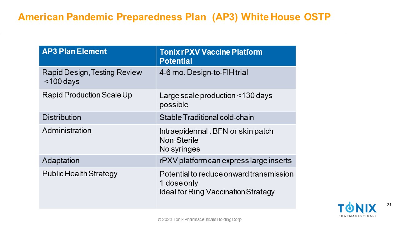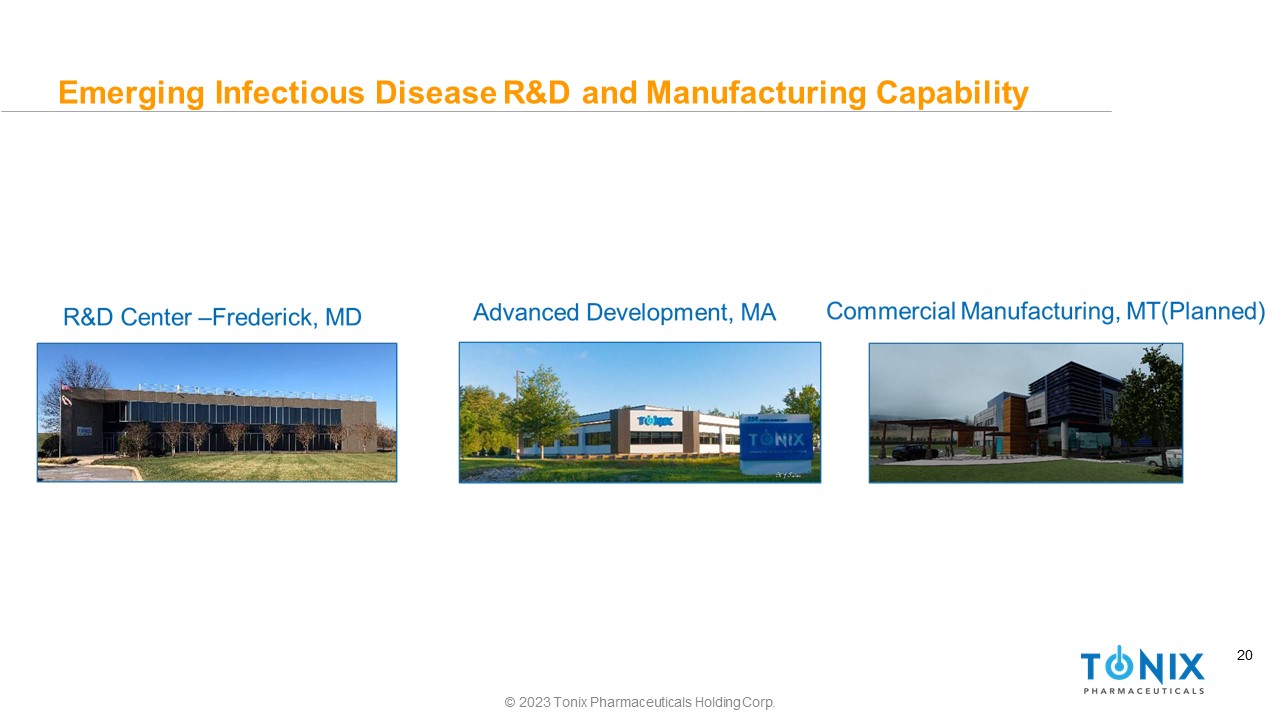 20 Emerging Infectious Disease R&D and Manufacturing Capability © 2023 Tonix Pharmaceuticals Holding Corp.