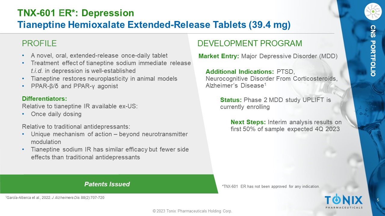 © 2023 Tonix Pharmaceuticals Holding Corp. 4 © 2023 Tonix Pharmaceuticals Holding Corp. CNS PORTFOLIO • The Sequenced Treatment Alternatives to Relieve Depression (STAR*D) study, regarded as the largest antidepressant trial ever conducted, indicated approximately 30% of depressed patients fail to achieve remission , even after multiple treatment attempts 1,2 • SSRIs are currently the most prescribed class of antidepressants, yet only about 50% of patients with MDD respond to initial SSRI treatment , and only 35 - 40% of those patients achieve full remission 1 • Antidepressant treatments often continue for years, and the side effect profiles of the monoaminergic antidepressants are intolerable to many • There is a high unmet need for new classes of antidepressants with different mechanisms of action High Unmet N eed for New C lasses of Antidepressants 1 Rush et al., 2006. Am J Psychiatry. 163:1905 – 1917 2 Rush et al., 2004. Control Clin Trials . 25(1):119 - 42