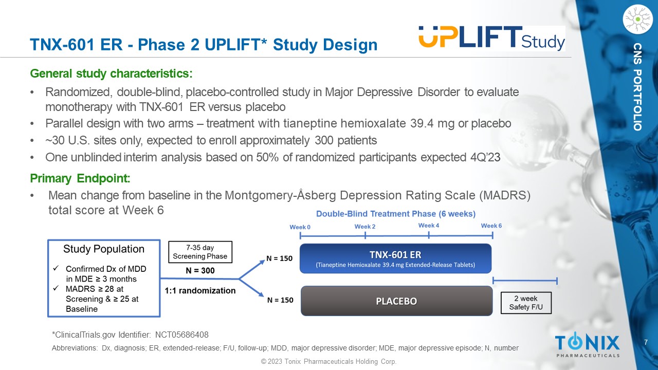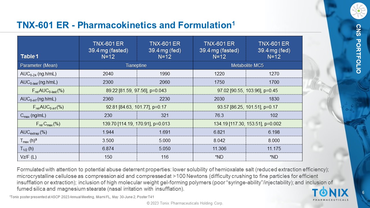 © 2023 Tonix Pharmaceuticals Holding Corp. 6 © 2023 Tonix Pharmaceuticals Holding Corp. CNS PORTFOLIO TNX - 601 ER - Pharmacokinetics and Formulation 1 TNX - 601 ER 39.4 mg (fed) N=12 TNX - 601 ER 39.4 mg (fasted) N=12 TNX - 601 ER 39.4 mg (fed) N=12 TNX - 601 ER 39.4 mg (fasted) N=12 Table 1 Metabolite MC5 Tianeptine Parameter (Mean) 1270 1220 1990 2040 AUC 0 - 24 ( ng.h /mL) 1700 1750 2060 2300 AUC 0 - last ( ng.h /mL) 97.02 [90.55, 103.96], p=0.45 89.22 [81.59, 97.56], p=0.043 F rel AUC 0 - last (%) 1830 2030 2230 2360 AUC 0 - inf ( ng.h /mL) 93.57 [86.25, 101.51], p=0.17 92.81 [84.63, 101.77], p=0.17 F rel AUC 0 - inf (%) 102 76.3 321 230 C max (ng/mL) 134.19 [117.30, 153.51], p=0.002 139.70 [114.19, 170.91], p=0.013 F rel C max (%) 6.198 6.821 1.691 1.944 AUC extrap (%) 8.000 8.042 5.000 3.500 T max (h) a 11.175 11.306 5.050 6.874 T 1/2 (h) *ND *ND 116 150 Vz /F (L) Formulated with attention to potential abuse deterrent properties: lower solubility of hemioxalate salt (reduced extraction efficiency); microcrystalline cellulose as compression aid and compressed at >100 Newtons (difficulty crushing to fine particles for effic ien t insufflation or extraction); inclusion of high molecular weight gel - forming polymers (poor “syringe - ability”/injectability); and inclusion of fumed silica and magnesium stearate (nasal irritation with insufflation). 1 Tonix poster presented at ASCP 2023 Annual Meeting, Miami FL, May 30 - June 2, Poster T41
