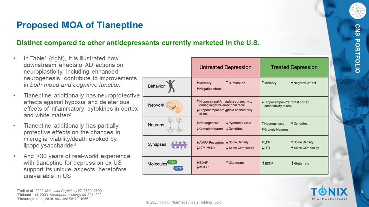 © 2023 Tonix Pharmaceuticals Holding Corp. 8 © 2023 Tonix Pharmaceuticals Holding Corp. CNS PORTFOLIO History of Tianeptine and TNX - 601 ER CNS PORTFOLIO • Tianeptine sodium (amorphous) immediate release (IR) tablets have been available in Europe and many countries in Asia and Latin America for the treatment of MDD since it was first marketed in France in 1989. Due to its short half - life, tianeptine sodium IR is taken three times daily, which is challenging for patient adherence. • Currently, there is no tianeptine - containing product approved in the U.S. and no extended - release tianeptine product approved anywhere in the world. • Tonix discovered a novel hemioxalate salt of tianeptine that may provide improved stability, consistency, and manufacturability compared to known salt forms of tianeptine. • TNX - 601 ER is taken once daily, increasing patient adherence and is thereby anticipated to improve the overall effectiveness of treatment compared to that of tianeptine sodium IR.