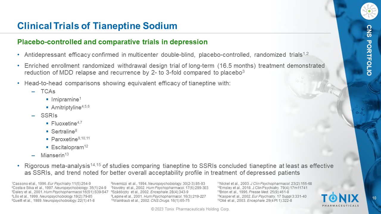 © 2023 Tonix Pharmaceuticals Holding Corp. 9 © 2023 Tonix Pharmaceuticals Holding Corp. CNS PORTFOLIO 1 Tartt et al., 2022. Molecular Psychiatry 27: 2689 – 2699. 2 Plaisant et al.,2003. Neuropharmacology 44: 801 – 809. 3 Slusarczyk et al., 2018. Int J Mol Sci 19: 1965. • In Table 1 (right), it is illustrated how downstream effects of AD actions on neuroplasticity, including enhanced neurogenesis, contribute to improvements in both mood and cognitive function • Tianeptine additionally has neuroprotective effects against hypoxia and deleterious effects of inflammatory cytokines in cortex and white matter 2 • Tianeptine additionally has partially protective effects on the changes in microglia viability/death evoked by lipopolysaccharide 3 • And >30 years of real - world experience with tianeptine for depression ex - US support its unique aspects, heretofore unavailable in US Proposed MOA of Tianeptine Distinct compared to other antidepressants currently marketed in the U.S.