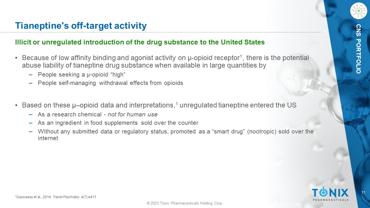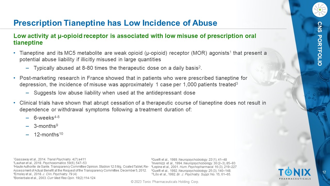 © 2023 Tonix Pharmaceuticals Holding Corp. 11 © 2023 Tonix Pharmaceuticals Holding Corp. CNS PORTFOLIO Tianeptine's off - target activity • Because of low affinity binding and agonist activity on µ - opioid receptor 1 , there is the potential abuse liability of tianeptine drug substance when available in large quantities by ‒ People seeking a µ - opioid “high” ‒ People self - managing withdrawal effects from opioids • Based on these µ – opioid data and interpretations, 1 unregulated tianeptine entered the US ‒ As a research chemical - not for human use ‒ As an ingredient in food supplements sold over the counter ‒ Without any submitted data or regulatory status, promoted as a “smart drug” (nootropic) sold over the internet Illicit or unregulated introduction of the drug substance to the United States 1 Gassaway et al., 2014. Transl Psychiatry . 4(7):e411