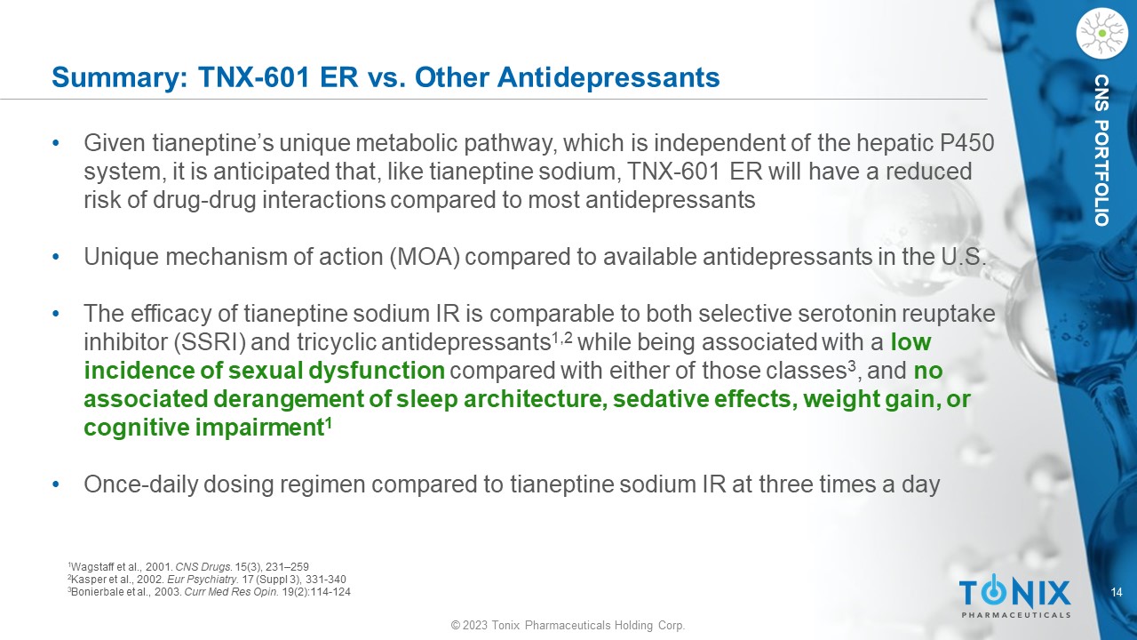 © 2023 Tonix Pharmaceuticals Holding Corp. 13 © 2023 Tonix Pharmaceuticals Holding Corp. CNS PORTFOLIO TNX - 601 ER Drug product • The only abuse - deterrent properties approved for the labels of certain marketed opioids are extended - release formulations with physiochemical barriers +/ - aversive components to abuse • TNX - 601 ER was formulated with attention to these potentially abuse deterrent properties: ‒ Active ingredient, tianeptine oxalate less soluble than sodium salt, reducing extraction efficiency in solvents such as water and alcohol ‒ Microcrystalline cellulose is a compression aid that results in extremely hard tablets, reducing ability to crush to fine particulate matter for insufflation or efficient extraction, pressed at >100 Newtons ‒ Inclusion of high molecular weight gel - forming polymers also adversely affects the “syringe - ability” and injectability of the drug product ‒ Inclusion of hydrophilic fumed silica as well as magnesium stearate may cause nasal irritation if insufflated; in high doses, orally ingested magnesium stearate may cause GI hyperactivity and irritation ‒ All potentially serve to make TNX - 601 ER a non - optimal source of tianeptine for high dose abuse TNX - 601 ER formulated with attention to FDA - guided potential abuse deterrent properties* *https://www.fda.gov/drugs/information - drug - class/final - guidance - evaluation - and - labeling - abuse - deterrent - opioids