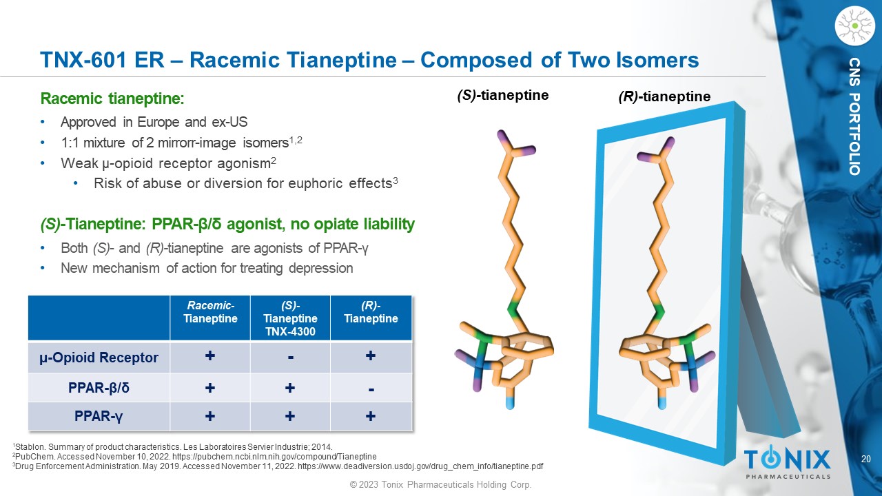 © 2023 Tonix Pharmaceuticals Holding Corp. 20 © 2023 Tonix Pharmaceuticals Holding Corp. CNS PORTFOLIO TNX - 601 ER – Racemic Tianeptine – Composed of Two Isomers Racemic tianeptine : • Approved in Europe and ex - US • 1:1 mixture of 2 mirror r - image isomers 1,2 • Weak µ - o pioid receptor agonism 2 • Risk of abuse or diversion for euphoric effects 3 (S) - Tianeptine: PPAR - β / δ agonist, no opiate liability • Both (S) - and (R) - tianeptine are agonists of PPAR - γ • New mechanism of action for treating depression (S) - t ianeptine (R) - tianeptine 1 Stablon. Summary of product characteristics. Les Laboratoires Servier Industrie ; 2014. 2 PubChem. Accessed November 10, 2022. https://pubchem.ncbi.nlm.nih.gov/compound/Tianeptine 3 Drug Enforcement Administration. May 2019. Accessed November 11, 2022. https://www.deadiversion.usdoj.gov/drug_chem_info/tianeptine.pdf (R) - Tianeptine (S) - Tianeptine TNX - 4300 Racemic - Tianeptine + - + µ - Opioid Receptor - + + PPAR - β / δ + + + PPAR - γ