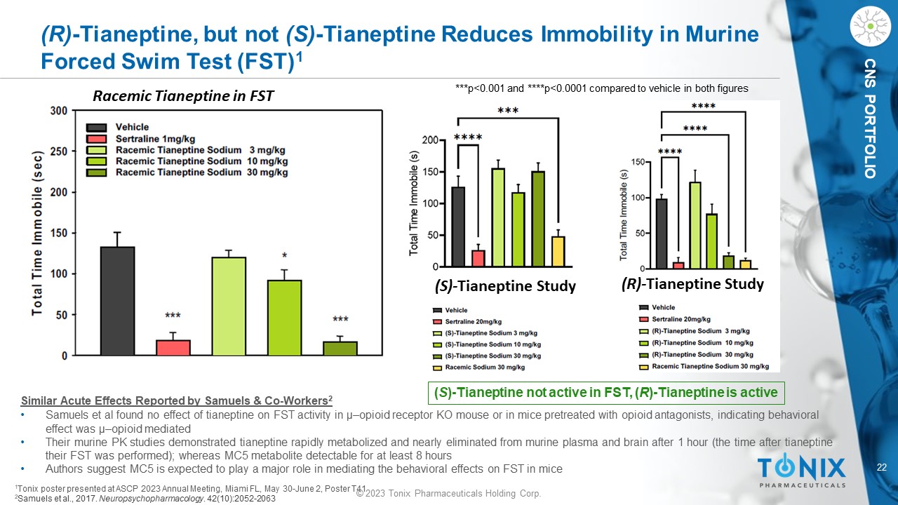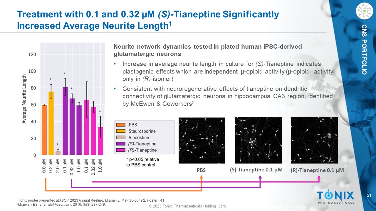 © 2023 Tonix Pharmaceuticals Holding Corp. 21 © 2023 Tonix Pharmaceuticals Holding Corp. CNS PORTFOLIO Treatment with 0.1 and 0.32 µM (S) - Tianeptine Significantly I ncreased A verage N eurite L ength 1 PBS (S) - Tianeptine 0.1 µM (R) - Tianeptine 0.1 µM Neurite network dynamics tested in plated human iPSC - derived glutamatergic neurons • Increase in average neurite length in culture for (S) - Tianeptine indicates plastogenic effects which are independent µ - opioid activity (µ - opioid activity only in (R) - isomer) • Consistent with neuroregenerative effects of tianeptine on dendritic connectivity of glutamatergic neurons in hippocampus CA3 region, identified by McEwen & Coworkers 2 1 Tonix poster presented at ASCP 2023 Annual Meeting, Miami FL, May 30 - June 2, Poster T41 2 McEwen BS, et al. Mol P sychiatry. 2010;15(3):237 - 249.