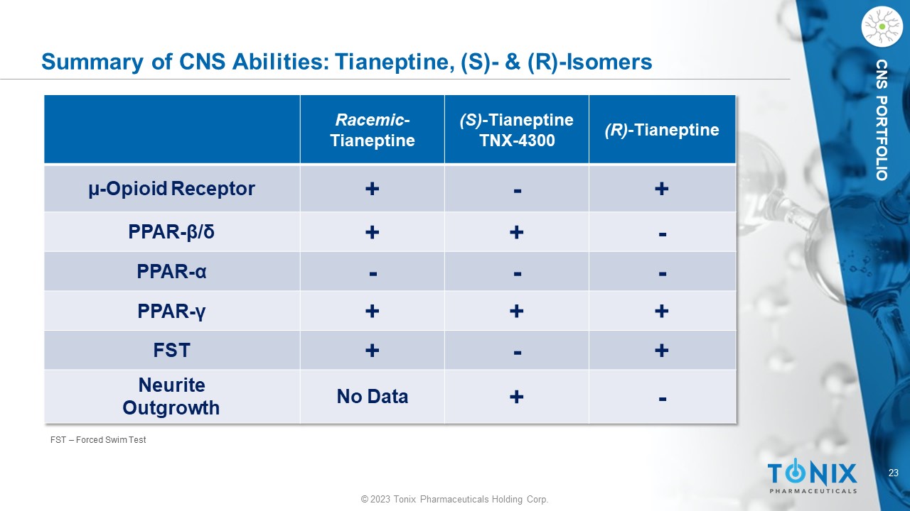 © 2023 Tonix Pharmaceuticals Holding Corp. 22 © 2023 Tonix Pharmaceuticals Holding Corp. CNS PORTFOLIO (R) - Tianeptine, but not (S) - Tianeptine Reduces Immobility in Murine Forced Swim Test (FST) 1 (S) - Tianeptine Study (R) - Tianeptine Study Racemic Tianeptine in FST Similar Acute Effects Reported by Samuels & Co - Workers 2 • Samuels et al found no effect of tianeptine on FST activity in µ – opioid receptor KO mouse or in mice pretreated with opioid anta gonists, indicating behavioral effect was µ – opioid mediated • Their murine PK studies demonstrated tianeptine rapidly metabolized and nearly eliminated from murine plasma and brain after 1 h our (the time after tianeptine their FST was performed); whereas MC5 metabolite detectable for at least 8 hours • Authors suggest MC5 is expected to play a major role in mediating the behavioral effects on FST in mice ( S ) - Tianeptine not active in FST, ( R ) - Tianeptine is active 1 Tonix poster presented at ASCP 2023 Annual Meeting, Miami FL, May 30 - June 2, Poster T41 2 Samuels et al., 2017. Neuropsychopharmacology . 42(10):2052 - 2063 ***p<0.001 and ****p<0.0001 compared to vehicle in both figures