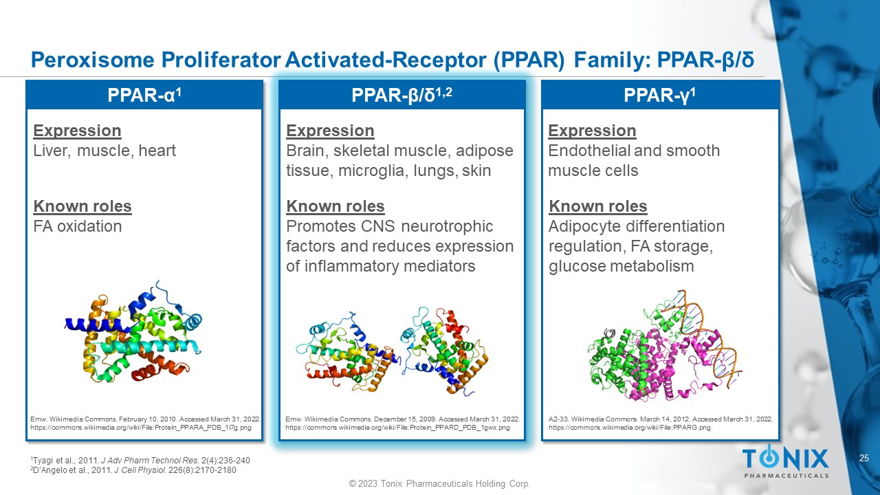 © 2023 Tonix Pharmaceuticals Holding Corp. 34 © 2023 Tonix Pharmaceuticals Holding Corp. PPAR Family Members: PPAR - γ Emw . Wikimedia Commons . February 10, 2010. Accessed March 31, 2022. https://commons.wikimedia.org/wiki/File:Protein_PPARA_PDB_1i7g.png Emw . Wikimedia Commons . December 15, 2009. Accessed March 31, 2022. https://commons.wikimedia.org/wiki/File:Protein_PPARD_PDB_1gwx.png A2 - 33. Wikimedia Commons . March 14, 2012. Accessed March 31, 2022. https://commons.wikimedia.org/wiki/File:PPARG.png Expression Liver, muscle, heart Known roles FA oxidation Expression Brain, skeletal muscle, adipose tissue, microglia, lungs, skin Known roles Promotes CNS neurotrophic factors and reduces expression of inflammatory mediators Expression Endothelial and smooth muscle cells Known roles Adipocyte differentiation regulation, FA storage, glucose metabolism PPAR - α 1 PPAR - β/δ 1,2 PPAR - γ 1 1 Tyagi et al., 2011. J Adv Pharm Technol Res . 2(4):236 - 240 2 D’Angelo et al., 2011. J Cell Physiol. 226(8):2170 - 2180