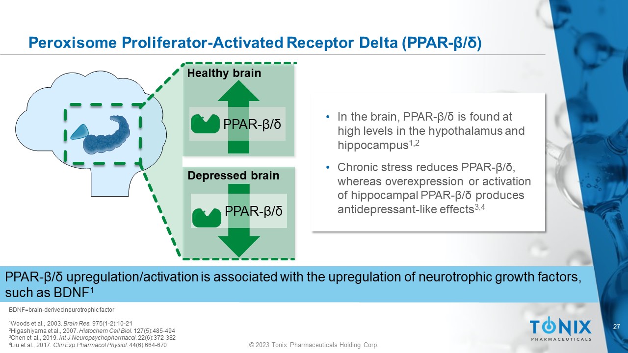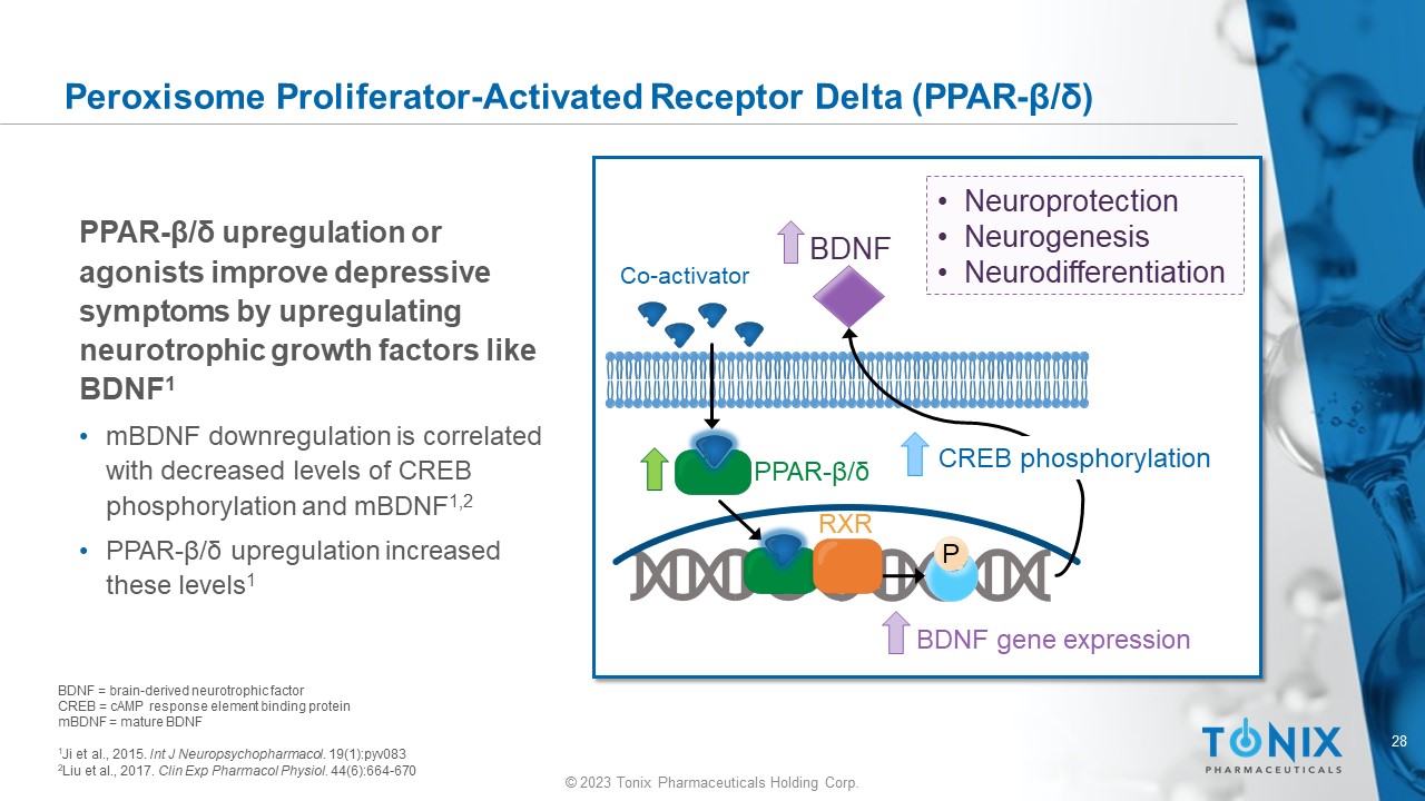 © 2023 Tonix Pharmaceuticals Holding Corp. 27 © 2023 Tonix Pharmaceuticals Holding Corp. Peroxisome Proliferator - Activated Receptor Delta (PPAR - β/δ) BDNF=brain - derived neurotrophic factor 1 Woods et al., 2003. Brain Res. 975(1 - 2):10 - 21 2 Higashiyama et al., 2007. Histochem Cell Biol . 127(5):485 - 494 3 Chen et al., 2019. Int J Neuropsychopharmacol . 22(6):372 - 382 4 Liu et al., 2017. Clin Exp Pharmacol Physiol. 44(6):664 - 670 • In the brain, PPAR - β/δ is found at high levels in the hypothalamus and hippocampus 1,2 • Chronic stress reduces PPAR - β/δ, whereas overexpression or activation of hippocampal PPAR - β/δ produces antidepressant - like effects 3,4 PPAR - β/δ upregulation/activation is associated with the upregulation of neurotrophic growth factors, such as BDNF 1 PPAR - β/δ Healthy brain PPAR - β/δ Depressed brain