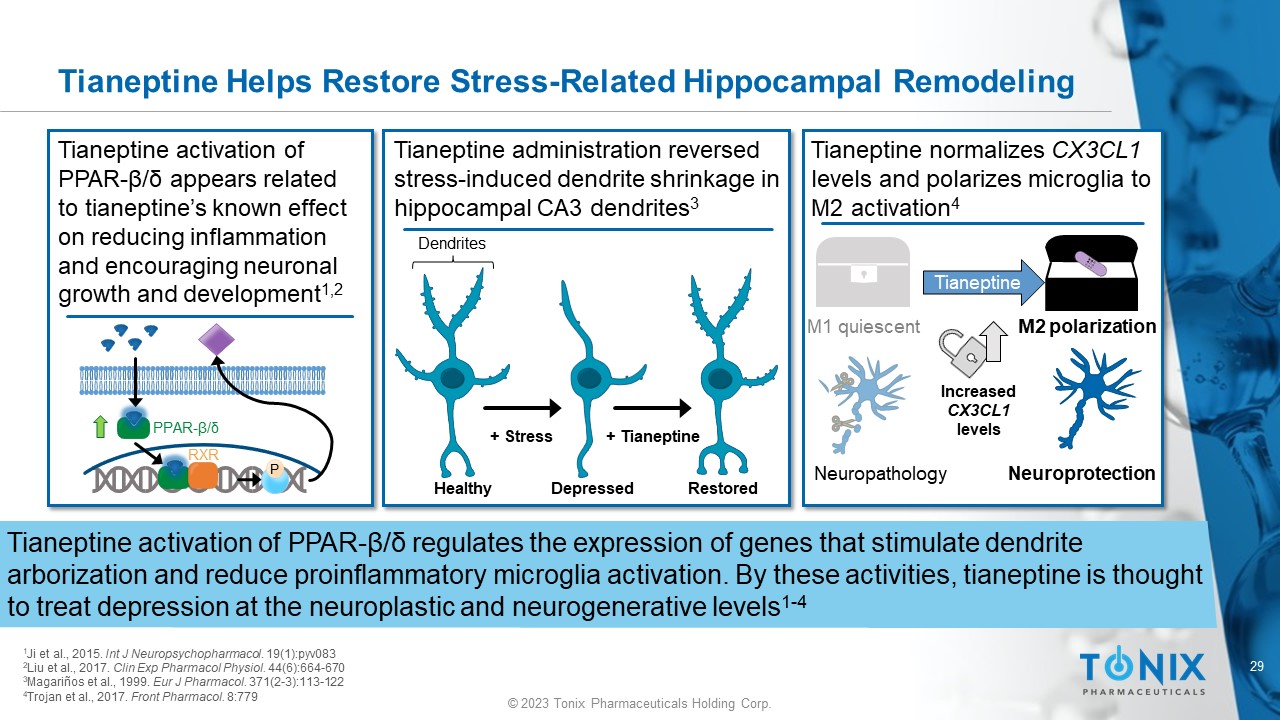 © 2023 Tonix Pharmaceuticals Holding Corp. 28 © 2023 Tonix Pharmaceuticals Holding Corp. Peroxisome Proliferator - Activated Receptor Delta (PPAR - β/δ) BDNF = brain - derived neurotrophic factor CREB = cAMP response element binding protein mBDNF = mature BDNF 1 Ji et al., 2015. Int J Neuropsychopharmacol . 19(1):pyv083 2 Liu et al., 2017. Clin Exp Pharmacol Physiol. 44(6):664 - 670 Co - activator PPAR - β/δ RXR P BDNF BDNF gene expression • Neuroprotection • Neurogenesis • Neurodifferentiation CREB phosphorylation PPAR - β/δ upregulation or agonists improve depressive symptoms by upregulating neurotrophic growth factors like BDNF 1 • mBDNF downregulation is correlated with decreased levels of CREB phosphorylation and mBDNF 1,2 • PPAR - β/δ upregulation increased these levels 1