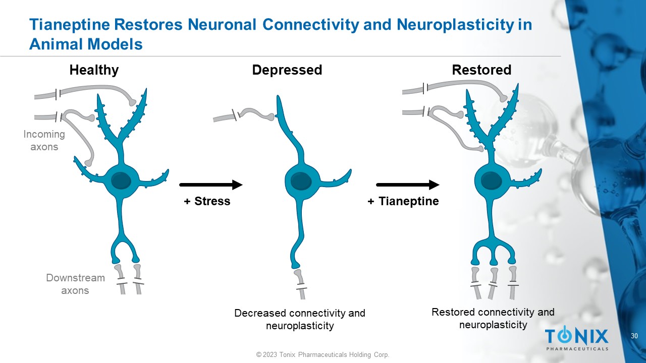 © 2023 Tonix Pharmaceuticals Holding Corp. 29 © 2023 Tonix Pharmaceuticals Holding Corp. Tianeptine Helps Restore Stress - Related Hippocampal Remodeling Tianeptine activation of PPAR - β / δ regulates the expression of genes that stimulate dendrite arborization and reduce proinflammatory microglia activation. By these activities, tianeptine is thought to treat depression at the neuroplastic and neurogenerative levels 1 - 4 Tianeptine administration reversed stress - induced dendrite shrinkage in hippocampal CA3 dendrites 3 Restored Healthy Tianeptine activation of PPAR - β/δ appears related to tianeptine’s known effect on reducing inflammation and encouraging neuronal growth and development 1,2 P Depressed Dendrites PPAR - β/δ RXR + Stress + Tianeptine Tianeptine normalizes CX3CL1 levels and polarizes microglia to M2 activation 4 Increased CX3CL1 levels Tianeptine M1 quiescent Neuroprotection Neuropathology M2 polarization 1 Ji et al., 2015. Int J Neuropsychopharmacol . 19(1):pyv083 2 Liu et al., 2017. Clin Exp Pharmacol Physiol. 44(6):664 - 670 3 Magariños et al., 1999. Eur J Pharmacol . 371(2 - 3):113 - 122 4 Trojan et al., 2017. Front Pharmacol . 8:779