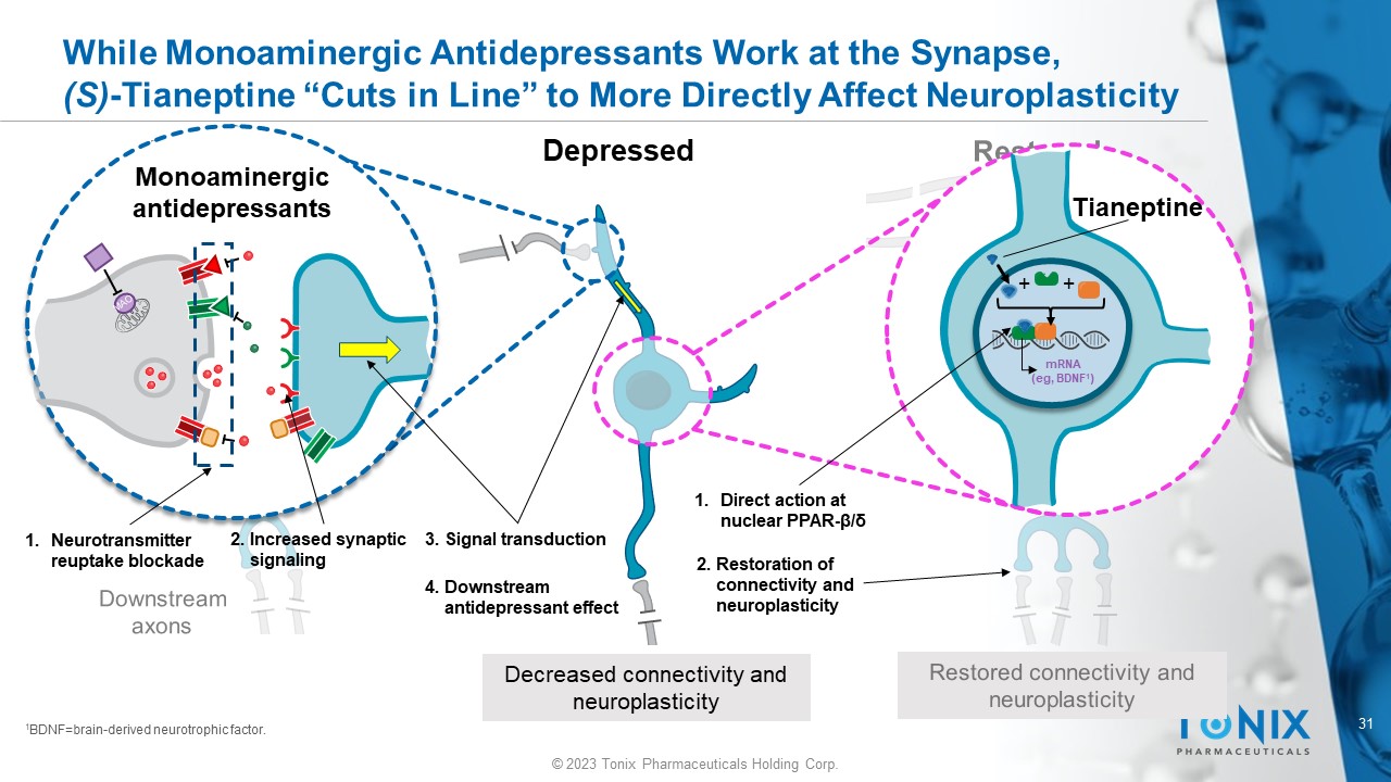 © 2023 Tonix Pharmaceuticals Holding Corp. 30 © 2023 Tonix Pharmaceuticals Holding Corp. Tianeptine Restores Neuronal Connectivity and Neuroplasticity in Animal Models Healthy Depressed Restored Decreased connectivity and neuroplasticity Restored connectivity and neuroplasticity + Stress + Tianeptine Incoming axons Downstream axons
