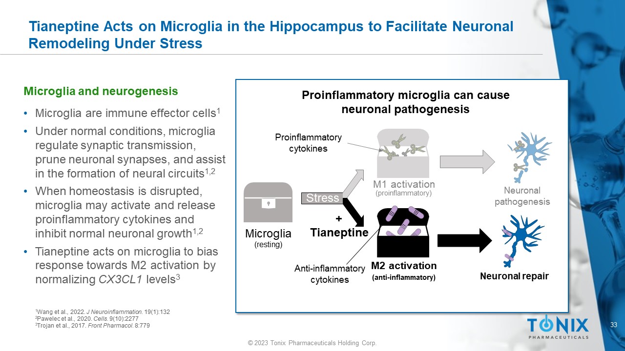 © 2023 Tonix Pharmaceuticals Holding Corp. 33 © 2023 Tonix Pharmaceuticals Holding Corp. • Microglia are immune effector cells 1 • Under normal conditions, microglia regulate synaptic transmission, prune neuronal synapses, and assist in the formation of neural circuits 1,2 • When homeostasis is disrupted, microglia may activate and release proinflammatory cytokines and inhibit normal neuronal growth 1,2 • Tianeptine acts on microglia to bias response towards M2 activation by normalizing CX3CL1 levels 3 Tianeptine Acts on Microglia in the Hippocampus to Facilitate Neuronal Remodeling Under Stress Microglia and neurogenesis Microglia (resting) Stress M1 activation (proinflammatory) M2 activation (anti - inflammatory) Neuronal pathogenesis Neuronal repair Proinflammatory cytokines Anti - inflammatory cytokines Proinflammatory microglia can cause neuronal pathogenesis + Tianeptine 1 Wang et al., 2022. J Neuroinflammation. 19(1):132 2 Pawelec et al., 2020. Cells. 9(10):2277 3 Trojan et al., 2017. Front Pharmacol . 8:779