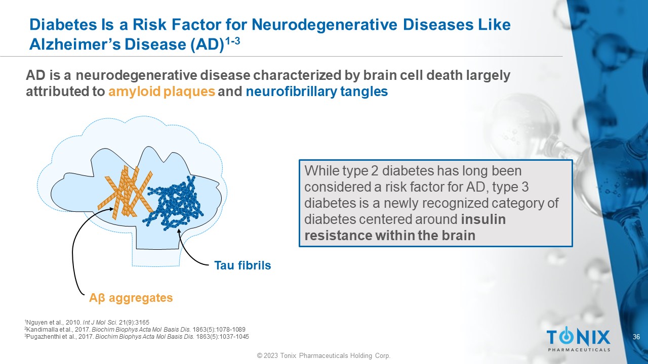 © 2023 Tonix Pharmaceuticals Holding Corp. 35 © 2023 Tonix Pharmaceuticals Holding Corp. Glucose metabolism • Insulin receptor substrate 1 (IRS - 1) • Insulin receptor substrate 2 (IRS - 2) • P85 subunit of PI3K • CAP Restore glucose - sensing ability PPAR - γ Restores Glucose - Sensing Ability in Type 2 Diabetes CAP=catabolite activator protein PI3K=phosphatidylinositol 3 - kinase Kim et al., 2004. Diabetologia . 47(12):2215 - 2225 Diabetes defines a group of diseases whose common trait is high blood sugar levels, which can result in damage to neurons, kidneys, eyes, and blood vessels In type 2 diabetes, the agonist class of TZDs has been shown to restore glucose - sensing ability (decrease insulin resistance) and trigger activation of insulin - responsive genes PPAR - γ RXR Thiazolidinediones ( TZDs )