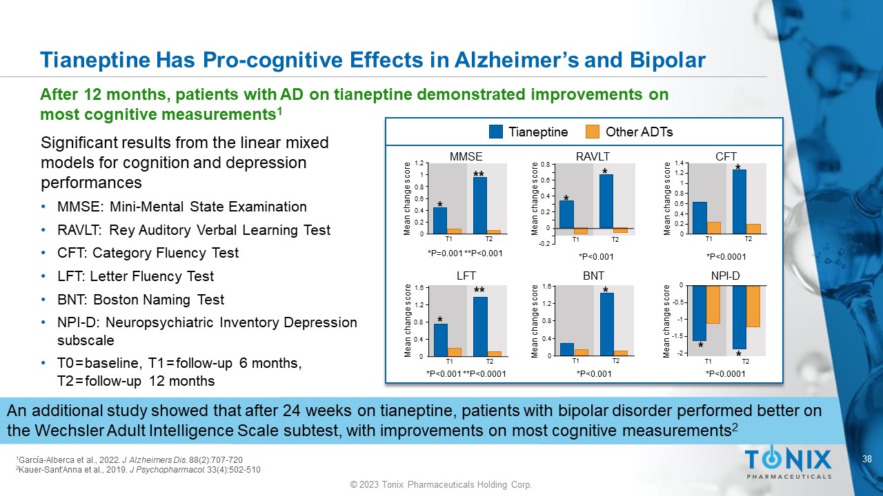 © 2023 Tonix Pharmaceuticals Holding Corp. 38 © 2023 Tonix Pharmaceuticals Holding Corp. Tianeptine Has Pro - cognitive Effects in Alzheimer’s and Bipolar After 12 months, patients with AD on tianeptine demonstrated improvements on most cognitive measurements 1 1 García - Alberca et al., 2022. J Alzheimers Dis. 88(2):707 - 720 2 Kauer - Sant'Anna et al., 2019. J Psychopharmacol . 33(4):502 - 510 Significant results from the linear mixed models for cognition and depression performances • MMSE: Mini - Mental State Examination • RAVLT: Rey Auditory Verbal Learning Test • CFT: Category Fluency Test • LFT: Letter Fluency Test • BNT: Boston Naming Test • NPI - D: Neuropsychiatric Inventory Depression subscale • T0 = baseline, T1 = follow - up 6 months, T2 = follow - up 12 months An additional study showed that after 24 weeks on tianeptine, patients with bipolar disorder performed better on the Wechsler Adult Intelligence Scale subtest, with improvements on most cognitive measurements 2 Tianeptine Other ADTs 1.2 0.8 1 0.6 0.4 0.2 0 MMSE T1 T2 Mean change score * ** *P=0.001 **P<0.001 0.8 0.4 0.6 0.2 0 - 0.2 RAVLT T1 T2 Mean change score * * 1.2 0.8 1 0.6 0.4 0.2 0 CFT T1 T2 Mean change score * 1.4 Mean change score 1.2 0.8 0.4 0 LFT T1 T2 * ** 1.6 1.6 0.8 1.2 0 0.4 Mean change score BNT T1 T2 * Mean change score 0 - 0.5 - 1 - 1.5 - 2 NPI - D T1 T2 * * *P<0.001 *P<0.0001 *P<0.001 **P<0.0001 *P<0.001 *P<0.0001