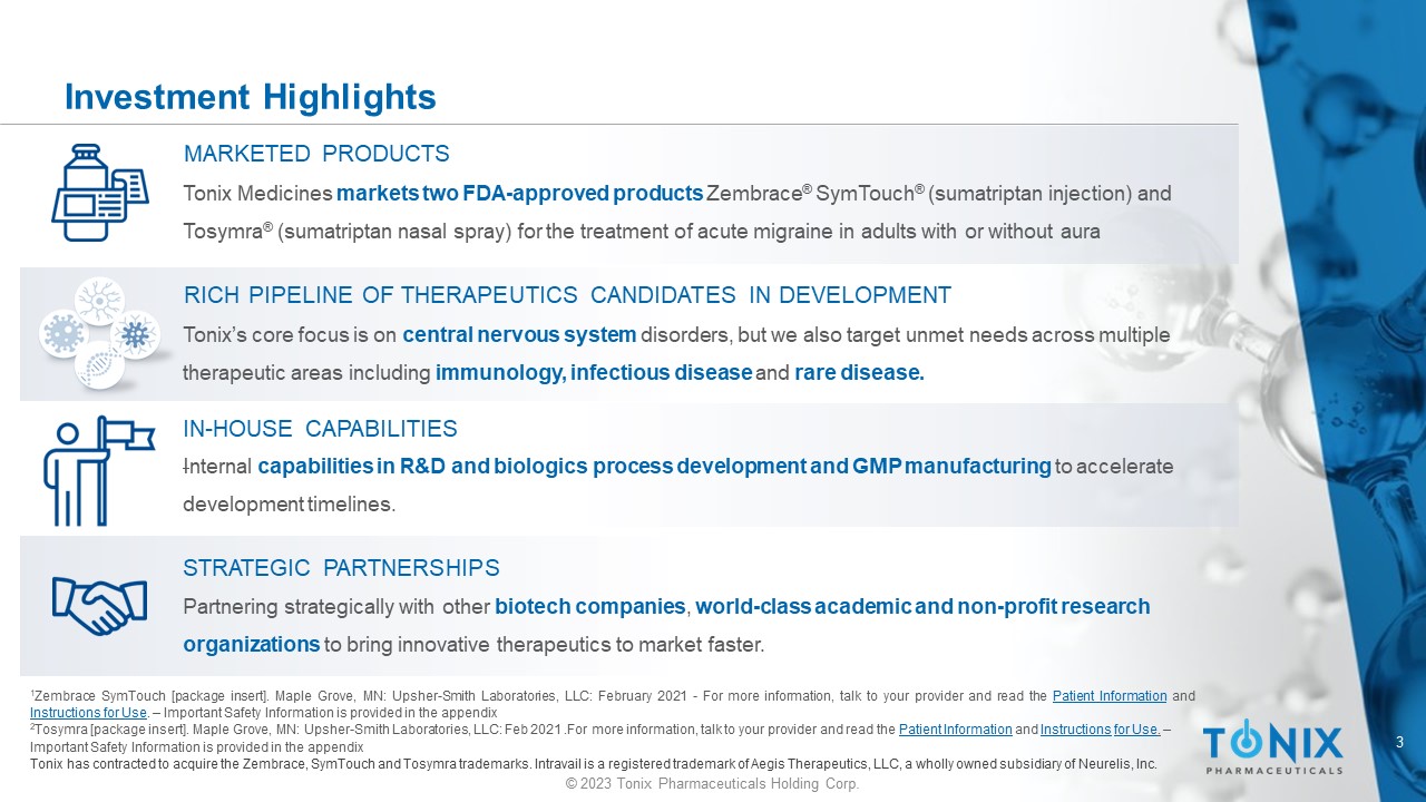 2 © 2023 Tonix Pharmaceuticals Holding Corp. Cautionary Note on Forward - Looking Statements Certain statements in this presentation regarding strategic plans, expectations and objectives for future operations or results are “forward - looking statements” as defined by the Private Securities Litigation Reform Act of 1995. These statements may be identified by the use of forward - looking words such as “anticipate,” “believe,” “forecast,” “estimate” and “intend,” among others. These forward - looking statements are based on Tonix’s current expectations and actual results could differ materially. There are a number of factors that could cause actual events to differ materially from those indicated by such forward - looking statements. These factors include, but are not limited to, the risks related to failure to obtain FDA clearances or approvals and noncompliance with FDA regulations; risks related to the failure to successfully market any of our products; risks related to the timing and progress of clinical development of our product candidates; our need for additional financing; uncertainties of patent protection and litigation; uncertainties of government or third party payor reimbursement; limited research and development efforts and dependence upon third parties; and substantial competition. As with any pharmaceutical under development, there are significant risks in the development, regulatory approval and commercialization of new products. The forward - looking statements in this presentation are made as of the date of this presentation, even if subsequently made available by Tonix on its website or otherwise. Tonix does not undertake an obligation to update or revise any forward - looking statement, except as required by law. Investors should read the risk factors set forth in the Annual Report on Form 10 - K for the year ended December 31, 2022, as filed with the Securities and Exchange Commission (the “SEC”) on March 13, 2023, and periodic reports and current reports filed with the SEC on or after the date thereof. All of Tonix's forward - looking statements are expressly qualified by all such risk factors and other cautionary statements.