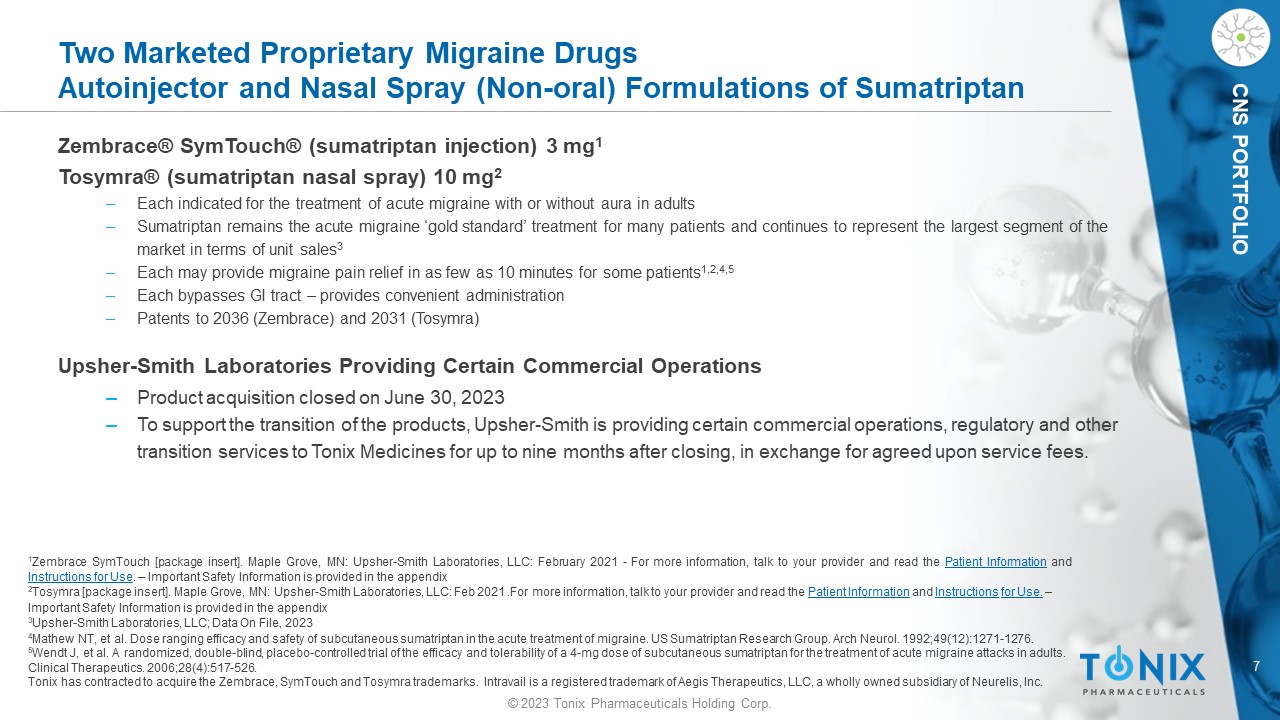 45 © 2023 Tonix Pharmaceuticals Holding Corp. CNS PORTFOLIO Zembrace ® IMPORTANT SAFETY INFORMATION (2 of 2) Zembrace may cause serious side effects including: • Changes in color or sensation in your fingers and toes; sudden or severe stomach pain, stomach pain after meals, weight loss, na usea or vomiting, constipation or diarrhea, bloody diarrhea, fever; cramping and pain in your legs or hips; feeling of heaviness or t igh tness in your leg muscles; burning or aching pain in your feet or toes while resting; numbness, tingling, or weakness in your legs; cold fe eli ng or color changes in one or both legs or feet; increased blood pressure including a sudden severe increase even if you have no history of high blood pressure; medication overuse headaches from using migraine medicine for 10 or more days each month. If your headaches g et worse, call your provider. • Serotonin syndrome, a rare but serious problem that can happen in people using Zembrace , especially when used with anti - depressant medicines called SSRIs or SNRIs. Call your provider right away if you have: mental changes such as seeing things that are not th ere (hallucinations), agitation, or coma; fast heartbeat; changes in blood pressure; high body temperature; tight muscles; or tro ubl e walking. • Hives (itchy bumps); swelling of your tongue, mouth, or throat • Seizures even in people who have never had seizures before The most common side effects of Zembrace include: pain and redness at injection site; tingling or numbness in your fingers or toes; dizziness; warm, hot, burning feeling to your face (flushing); discomfort or stiffness in your neck; feeling weak, drowsy, or ti red. Tell your provider if you have any side effect that bothers you or does not go away. These are not all the possible side effe cts of Zembrace . For more information, ask your provider. This is the most important information to know about Zembrace but is not comprehensive. For more information, talk to your provider and read the Patient Information and Instructions for Use . You can also visit www.upsher - smith.com or call 1 - 888 - 650 - 3789. For full Prescribing Information, visit: https://dailymed.nlm.nih.gov/dailymed/drugInfo.cfm?setid=6e5b104f - 2b9e - 416e - 92fb - ef1bdaea867d You are encouraged to report adverse effects of prescription drugs to the FDA. Visit www.fda.gov/medwatch or call 1 - 800 - FDA - 1088. Zembrace is a prescription medicine used to treat acute migraine headaches with or without aura in adults who have been diagnosed with migraine. Zembrace is not used to prevent migraines. It is not known if it is safe and effective in children under 18 years of age.
