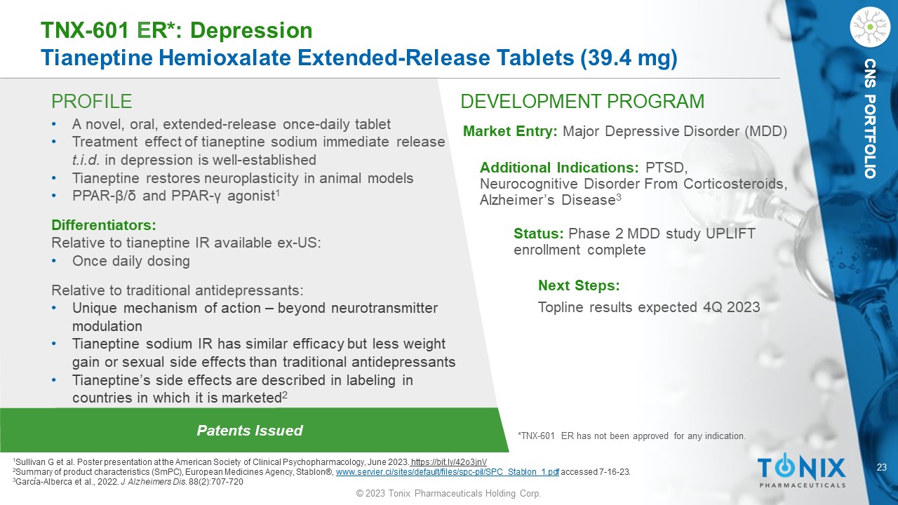 27 © 2023 Tonix Pharmaceuticals Holding Corp. CNS PORTFOLIO PROFILE DEVELOPMENT PROGRAM Patents Issued TNX - 4300*: Depression, Alzheimer’s & Parkinson’s diseases Estianeptine (Single (S) - isomer of Tianeptine) CNS PORTFOLIO • Single isomer, oral treatment • Proposed mechanism of action from lab studies indicates estianeptine is the active ingredient of TNX - 601 ER 1 • PPAR - β / δ and PPAR - γ agonist • Free of µ - opioid receptor activity • Estianeptine restores neuroplasticity in tissue culture Differentiators: Relative to racemic tianeptine IR or TNX - 601 ER: • Lack of opioid liability Relative to traditional antidepressants: • Unique mechanism of action – beyond neurotransmitter modulation • Racemic tianeptine sodium IR has similar efficacy but fewer side effects than traditional antidepressants Market Entry: Major Depressive Disorder (MDD) Additional Indications: PTSD, Neurocognitive Disorder From Corticosteroids, Alzheimer’s Disease 2 Status: Pre - clinical Next Steps: Expect IND can be supported by pre - clinical and clinical data from TNX - 601 (racemic tianeptine) development 1 Sullivan G et al. Poster presentation at the American Society of Clinical Psychopharmacology, June 2023 . https://bit.ly/42o3jnV 2 García - Alberca et al., 2022. J Alzheimers Dis . 88(2):707 - 720 *TNX - 4300 is in the pre - IND stage of development and has not been approved for any indication