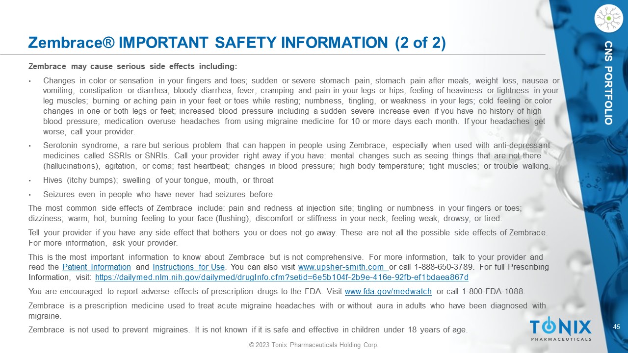 44 © 2023 Tonix Pharmaceuticals Holding Corp. CNS PORTFOLIO Zembrace ® IMPORTANT SAFETY INFORMATION (1 of 2) Zembrace SymTouch ( Zembrace ) can cause serious side effects, including heart attack and other heart problems, which may lead to death. Stop use and get emergency help if you have any signs of a heart attack: D iscomfort in the center of your chest that lasts for more than a few minutes or goes away and comes back; severe tightness, pain, pressure, or heaviness in your chest, throat, neck, or jaw; pain or discomfort in your arms, back, neck, jaw or stomach ; shortness of breath with or without chest discomfort ; breaking out in a cold sweat ; nausea or vomiting ; feeling lightheaded Zembrace is not for people with risk factors for heart disease (high blood pressure or cholesterol, smoking, overweight, diabetes, family history of heart disease) unless a heart exam shows no problem. Do not use Zembrace if you have: H istory of heart problems ; narrowing of blood vessels to your legs, arms, stomach, or kidney (peripheral vascular disease) ; uncontrolled high blood pressure ; hemiplegic or basilar migraines. If you are not sure if you have these, ask your provider. H ad a stroke, transient ischemic attacks (TIAs), or problems with blood circulation ; severe liver problems ; taken any of the following medicines in the last 24 hours: almotriptan , eletriptan , frovatriptan , naratriptan, rizatriptan, ergotamines , dihydroergotamine ; are taking certain antidepressants, known as monoamine oxidase (MAO) - A inhibitors or it has been 2 weeks or less since you stopped taking a MAO - A inhibitor. Ask your provider for a list of these medicines if you are not sure. A n allergy to sumatriptan or any of the components of Zembrace Tell your provider about all of your medical conditions and medicines you take, including vitamins and supplements. Zembrace can cause dizziness, weakness, or drowsiness. If so, do not drive a car, use machinery, or do anything where you need to be alert.