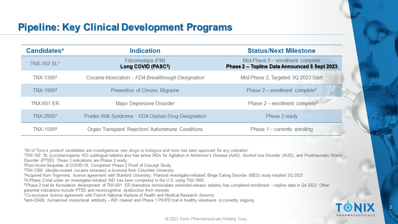 2 © 2023 Tonix Pharmaceuticals Holding Corp. Pipeline: Key Clinical Development Programs Status/Next Milestone Indication Candidates* Mid - Phase 3 – enrollment complete Phase 2 – Topline Data Announced 5 Sept 2023 Fibromyalgia (FM) Long COVID (PASC 2 ) TNX - 102 SL 1 Mid - Phase 2, Targeted 3Q 2023 Start Cocaine Intoxication - FDA Breakthrough Designation TNX - 1300 3 Phase 2 – enrollment complete 5 Prevention of Chronic Migraine TNX - 1900 4 Phase 2 – enrollment complete 6 Major Depressive Disorder TNX - 601 ER Phase 2 ready Prader - Willi Syndrome - FDA Orphan Drug Designation TNX - 2900 7 Phase 1 – currently enrolling Organ Transplant Rejection/ Autoimmune Conditions TNX - 1500 8 *All of Tonix’s product candidates are investigational new drugs or biologics and none has been approved for any indication. 1 TNX - 102 SL (cyclobenzaprine HCl sublingual tablets) also has active INDs for Agitation in Alzheimer’s Disease (AAD), Alcohol Use Disorder (AUD), and Posttraumatic Stress Disorder (PTSD). These 3 indications are Phase 2 ready 2 Post - Acute Sequelae of COVID - 19. Completed Phase 2 Proof of Concept Study 3 TNX - 1300 (double - mutant cocaine esterase) is licensed from Columbia University 4 Acquired from Trigemina ; license agreement with Stanford University; Planned investigator - initiated Binge Eating Disorder (BED) study initiated 3 Q 2023 5 A Phase 2 trial under an investigator - initiated IND has been completed in the U.S. using TNX - 1900 6 Phase 2 trial for formulation development of TNX - 601 ER (tianeptine hemioxalate extended - release tablets) has completed enrollme nt – topline data in Q4 2023 ; Other potential indications include PTSD and neurocognitive dysfunction from steroids 7 Co - exclusive license agreement with French National Institute of Health and Medical Research ( Inserm ) 8 anti - CD40L humanized monoclonal antibody – IND cleared and Phase 1 PK/PD trial in healthy volunteers is currently ongoing