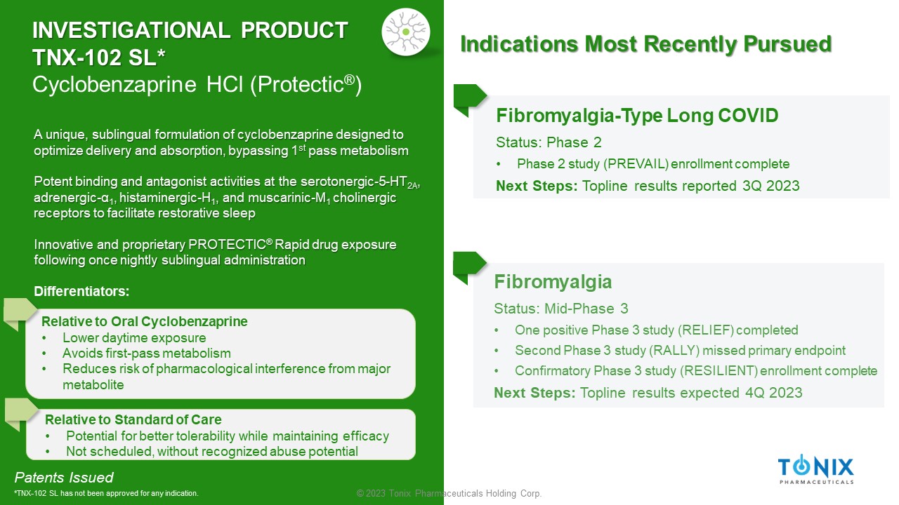 © 2023 Tonix Pharmaceuticals Holding Corp. INVESTIGATIONAL PRODUCT TNX - 102 SL* Cyclobenzaprine HCl ( Protectic ® ) Fibromyalgia Status: Mid - Phase 3 • One positive Phase 3 study (RELIEF) completed • Second Phase 3 study (RALLY) missed primary endpoint • Confirmatory Phase 3 study (RESILIENT) enrollment complete Next Steps: Topline results expected 4Q 2023 Fibromyalgia - Type Long COVID Status: Phase 2 • Phase 2 study (PREVAIL) enrollment complete Next Steps: Topline results reported 3Q 2023 Patents Issued *TNX - 102 SL has not been approved for any indication. A unique, sublingual formulation of cyclobenzaprine designed to optimize delivery and absorption, bypassing 1 st pass metabolism Potent binding and antagonist activities at the serotonergic - 5 - HT 2A , adrenergic - α 1 , histaminergic - H 1 , and muscarinic - M 1 cholinergic receptors to facilitate restorative sleep Innovative and proprietary PROTECTIC ® Rapid drug exposure following once nightly sublingual administration Differentiators: Relative to Oral Cyclobenzaprine • Lower daytime exposure • Avoids first - pass metabolism • Reduces risk of pharmacological interference from major metabolite Relative to Standard of Care • Potential for better tolerability while maintaining efficacy • Not scheduled, without recognized abuse potential Indications Most Recently Pursued
