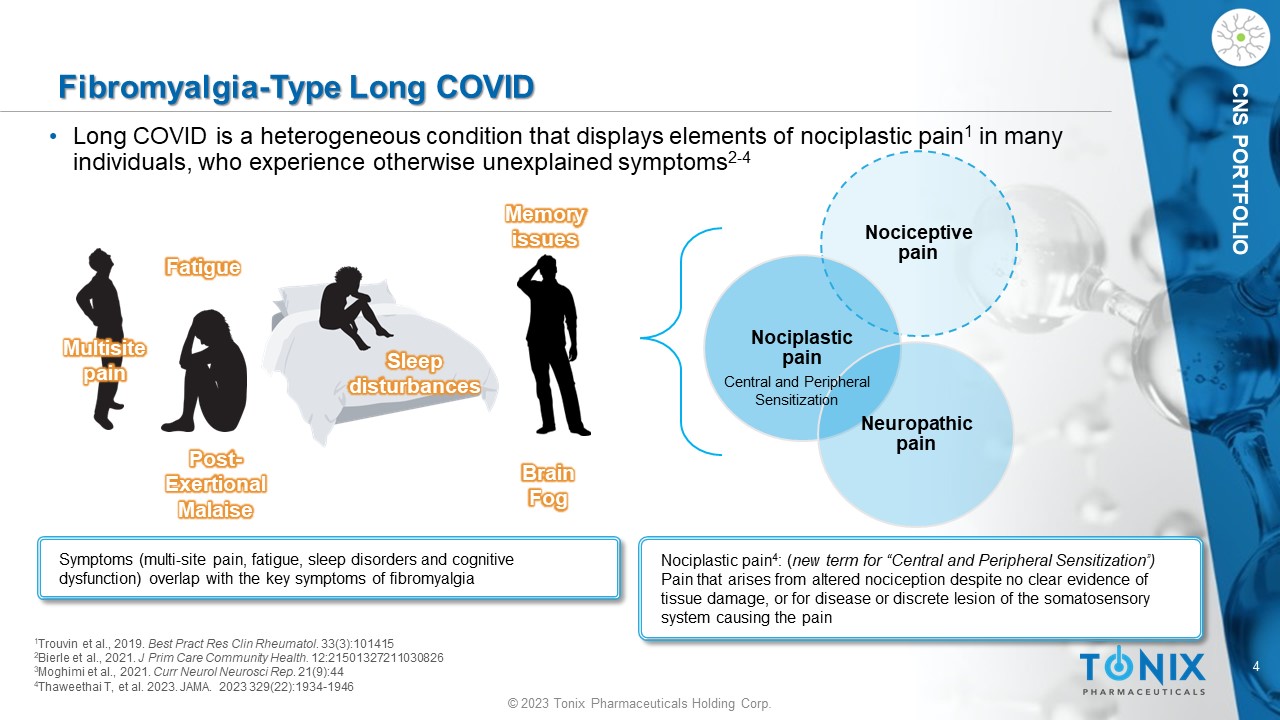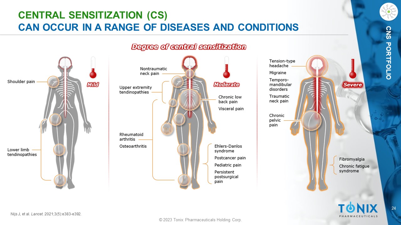 23 © 2023 Tonix Pharmaceuticals Holding Corp. CNS PORTFOLIO CENTRAL SENSITIZATION (CS) A FEATURE OF MANY NOCIPLASTIC PAIN SYNDROMES • CS is caused by amplified neural signaling in CNS pain circuits 1 - 3 • Patients with CS perceive higher pain to a slightly noxious stimuli than in non - CS individuals (hyperalgesia) 1 • Severe CS can lead to hypersensitivity to stimuli that are not typically painful (allodynia) 2 • CS varies in severity and is observed in syndromes including FM and ME/CFS 1,3 Stimulus Intensity Pain Perception Normal Pain Hyperalgesia Allodynia Central Sensitization Intensity 1 CFS/ME – chronic fatigue syndrome/ myalgic encephalomyelitis 2 FM - fibromyalgia 3 Nijs J, et al. Lancet . 2021;3(5):e383 - e392.
