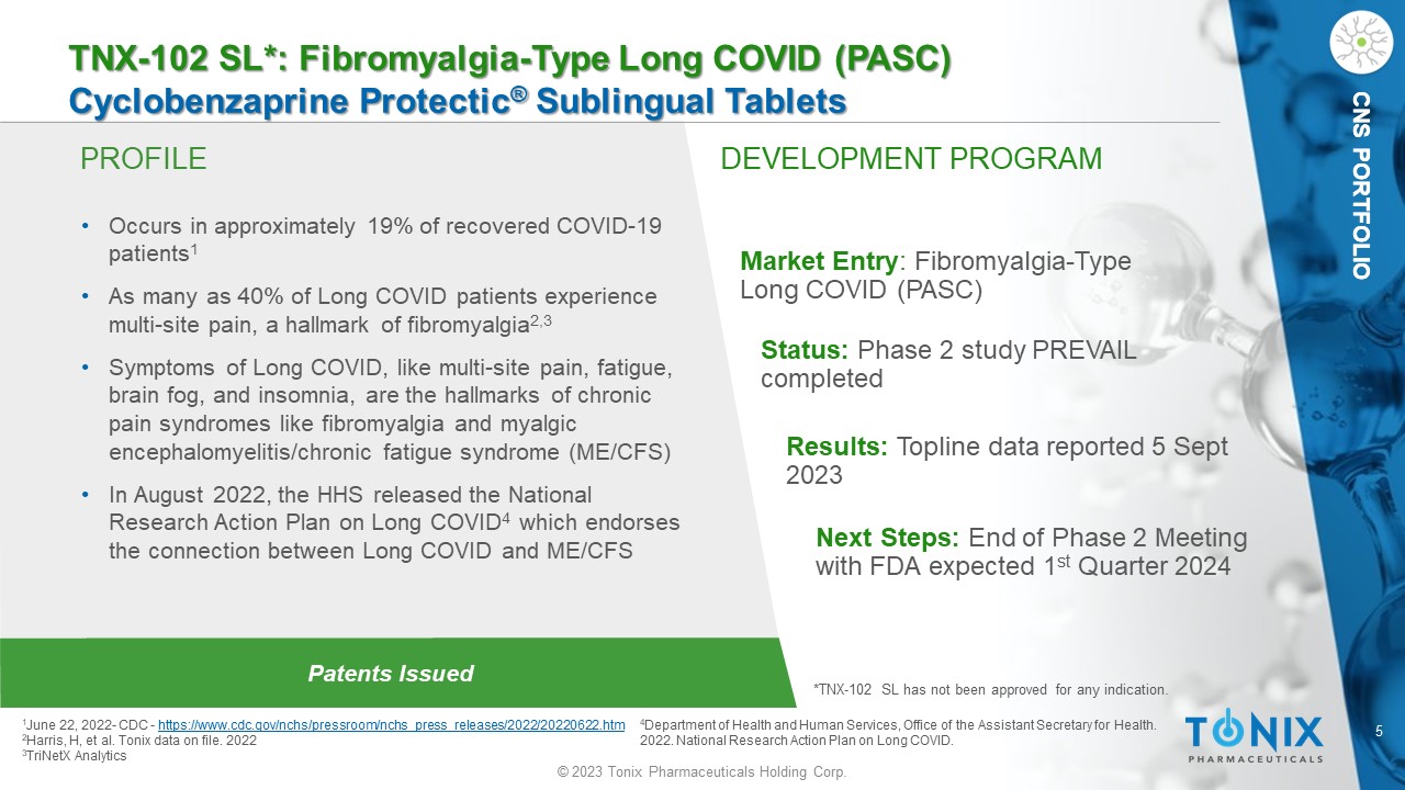 4 © 2023 Tonix Pharmaceuticals Holding Corp. CNS PORTFOLIO Fibromyalgia - Type Long COVID • Long COVID is a heterogeneous condition that displays elements of nociplastic pain 1 in many individuals, who experience otherwise unexplained symptoms 2 - 4 Symptoms (multi - site pain, fatigue, sleep disorders and cognitive dysfunction) overlap with the key symptoms of fibromyalgia Multisite pain Memory issues Fatigue Sleep disturbances 1 Trouvin et al., 2019. Best Pract Res Clin Rheumatol . 33(3):101415 2 Bierle et al., 2021. J Prim Care Community Health. 12:21501327211030826 3 Moghimi et al., 2021. Curr Neurol Neurosci Rep . 21(9):44 4 Thaweethai T, et al. 2023. JAMA. 2023 329(22):1934 - 1946 Nociceptive pain Nociplastic pain Neuropathic pain Nociplastic pain 4 : ( new term for “Central and Peripheral Sensitization”) Pain that arises from altered nociception despite no clear evidence of tissue damage, or for disease or discrete lesion of the somatosensory system causing the pain Central and Peripheral Sensitization Post - Exertional Malaise Brain Fog