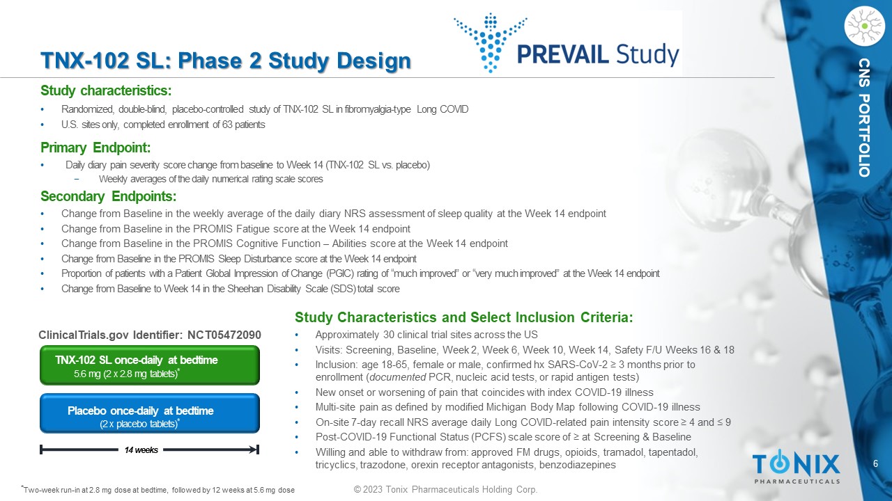 5 © 2023 Tonix Pharmaceuticals Holding Corp. CNS PORTFOLIO PROFILE DEVELOPMENT PROGRAM Patents Issued TNX - 102 SL*: Fibromyalgia - Type Long COVID (PASC) Cyclobenzaprine Protectic ® Sublingual Tablets • Occurs in approximately 19% of recovered COVID - 19 patients 1 • As many as 40% of Long COVID patients experience multi - site pain, a hallmark of fibromyalgia 2,3 • Symptoms of Long COVID, like multi - site pain, fatigue, brain fog, and insomnia, are the hallmarks of chronic pain syndromes like fibromyalgia and myalgic encephalomyelitis/chronic fatigue syndrome (ME/CFS) • In August 2022, the HHS released the National Research Action Plan on Long COVID 4 which endorses the connection between Long COVID and ME/CFS Market Entry : Fibromyalgia - Type Long COVID (PASC) Status: Phase 2 study PREVAIL completed Results : Topline data reported 5 Sept 2023 1 J une 22, 2022 - CDC - https://www.cdc.gov/nchs/pressroom/nchs_press_releases/2022/20220622.htm 2 Harris, H, et al. Tonix data on file. 2022 3 TriNetX Analytics *TNX - 102 SL has not been approved for any indication. CNS PORTFOLIO 4 Department of Health and Human Services, Office of the Assistant Secretary for Health. 2022. National Research Action Plan on Long COVID. Next Steps: End of Phase 2 Meeting with FDA expected 1 st Quarter 2024