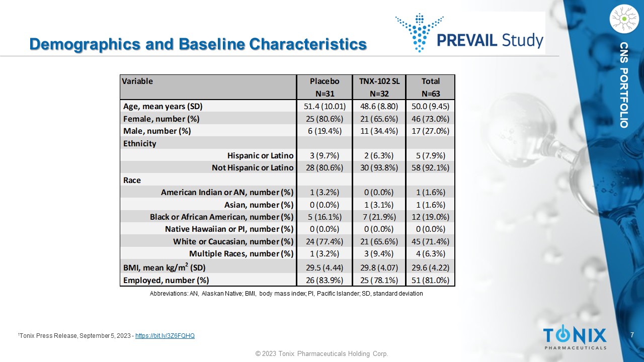 6 © 2023 Tonix Pharmaceuticals Holding Corp. CNS PORTFOLIO TNX - 102 SL: Phase 2 Study Design Study c haracteristics: • Randomized, double - blind, placebo - controlle d study of TNX - 102 SL in fibromyalgia - type Long COVID • U.S. sites only, completed enrollment of 63 patients Primary Endpoint: • Daily diary pain severity score change from baseline to Week 14 (TNX - 102 SL vs. placebo) − Weekly averages of the daily numerical rating scale scores Secondary Endpoints: • Change from Baseline in the weekly average of the daily diary NRS assessment of sleep quality at the Week 14 endpoint • Change from Baseline in the PROMIS Fatigue score at the Week 14 endpoint • Change from Baseline in the PROMIS Cognitive Function – Abilities score at the Week 14 endpoint • Change from Baseline in the PROMIS Sleep Dis turbance score at the Week 14 endpoint • Proportion of patients with a Patient Global Impression of Change (PGIC) rating of “much improved” or “very much improved” at th e Week 14 endpoint • Change from Baseline to Week 14 in the Sheehan Disability Scale (SDS) total score Placebo once - daily at bedtime 14 weeks TNX - 102 SL once - daily at bedtime 5.6 mg (2 x 2.8 mg tablets) * * Two - week run - in at 2.8 mg dose at bedtime, followed by 12 weeks at 5.6 mg dose ClinicalTrials.gov Identifier: NCT05472090 (2 x placebo tablets) * Study Characteristics and Select Inclusion Criteria: • Approximately 30 clinical trial sites across the US • Visits: Screening, Baseline, Week 2, Week 6, Week 10, Week 14, Safety F/U Weeks 16 & 18 • Inclusion: age 18 - 65, female or male, confirmed hx SARS - CoV - 2 ≥ 3 months prior to enrollment ( documented PCR, nucleic acid tests, or rapid antigen tests) • New onset or worsening of pain that coincides with index COVID - 19 illness • Multi - site pain as defined by modified Michigan Body Map following COVID - 19 illness • O n - site 7 - day recall NRS average daily Long COVID - r elated pain intensity score ≥ 4 and ≤ 9 • Post - COVID - 19 Functional Status (PCFS) scale score of ≥ at Screening & Baseline • Willing and able to withdraw from: approved FM drugs, opioids, tramadol, tapentadol, tricyclics, trazodone, orexin receptor antagonists, benzodiazepines