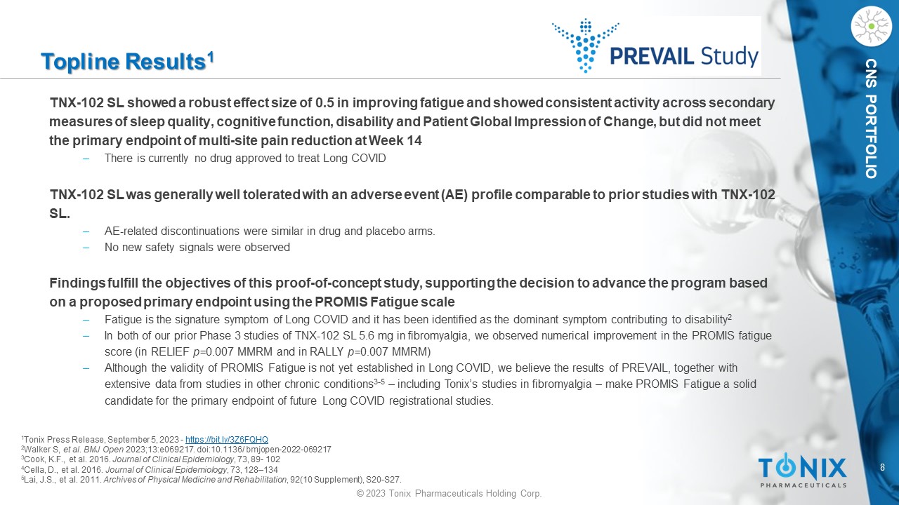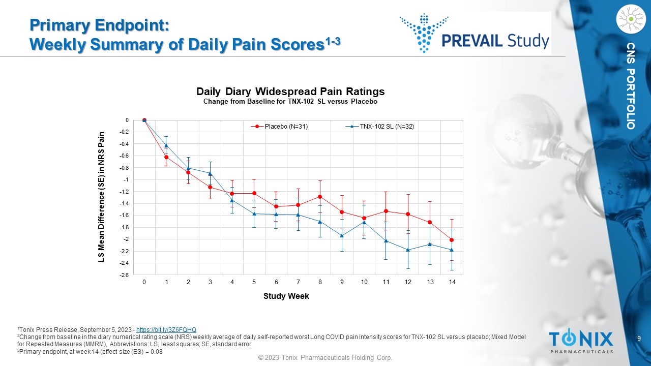 8 © 2023 Tonix Pharmaceuticals Holding Corp. CNS PORTFOLIO Topline Results 1 TNX - 102 SL showed a robust effect size of 0.5 in improving fatigue and showed consistent activity across secondary measures of sleep quality, cognitive function, disability and Patient Global Impression of Change, but did not meet the primary endpoint of multi - site pain reduction at Week 14 ‒ There is currently no drug approved to treat Long COVID TNX - 102 SL was generally well tolerated with an adverse event (AE) profile comparable to prior studies with TNX - 102 SL. ‒ AE - related discontinuations were similar in drug and placebo arms. ‒ No new safety signals were observed Findings fulfill the objectives of this proof - of - concept study, supporting the decision to advance the program based on a proposed primary endpoint using the PROMIS Fatigue scale ‒ Fatigue is the signature symptom of Long COVID and it has been identified as the dominant symptom contributing to disability 2 ‒ In both of our prior Phase 3 studies of TNX - 102 SL 5.6 mg in fibromyalgia, we observed numerical improvement in the PROMIS fatig ue score (in RELIEF p= 0.007 MMRM and in RALLY p= 0.007 MMRM) ‒ Although the validity of PROMIS Fatigue is not yet established in Long COVID, we believe the results of PREVAIL, toge ther with extensive data from studies in other chronic conditions 3 - 5 – including Tonix’s studies in fibromyalgia – make PROMIS Fatigue a solid candidate for the primary endpoint of future Long COVID registrational studies. 1 Tonix Press Release, September 5, 2023 - https://bit.ly/3Z6FQHQ 2 Walker S, et al . BMJ Open 2023;13:e069217. doi:10.1136/ bmjopen - 2022 - 069217 3 Cook, K.F., et al. 2016. Journal of Clinical Epidemiology , 73, 89 - 102 4 Cella, D., et al. 2016. Journal of Clinical Epidemiology , 73, 128 – 134 5 Lai, J.S., et al. 2011. Archives of Physical Medicine and Rehabilitation , 92(10 Supplement), S20 - S27.