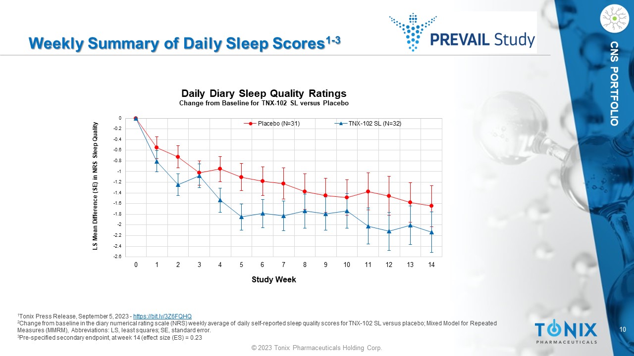 9 © 2023 Tonix Pharmaceuticals Holding Corp. CNS PORTFOLIO Primary Endpoint: Weekly Summary of Daily Pain Scores 1 - 3 1 Tonix Press Release, September 5, 2023 - https://bit.ly/3Z6FQHQ 2 Change from baseline in the diary numerical rating scale (NRS) weekly average of daily self - reported worst Long COVID pain inten sity scores for TNX - 102 SL versus placebo; M ixed Model for Repeated Measures (MMRM), Abbreviations: LS, least squares; SE, standard error. 3 Primary endpoint, at week 14 (effect size (ES) = 0.08 -2.6 -2.4 -2.2 -2 -1.8 -1.6 -1.4 -1.2 -1 -0.8 -0.6 -0.4 -0.2 0 0 1 2 3 4 5 6 7 8 9 10 11 12 13 14 LS Mean Difference (SE) in NRS Pain Study Week Daily Diary Widespread Pain Ratings Change from Baseline for TNX - 102 SL versus Placebo Placebo (N=31) TNX-102 SL (N=32)