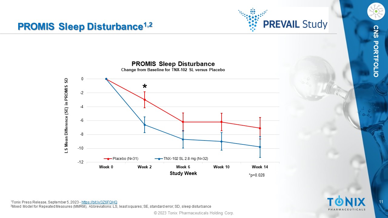 10 © 2023 Tonix Pharmaceuticals Holding Corp. CNS PORTFOLIO Weekly Summary of Daily Sleep Scores 1 - 3 1 Tonix Press Release, September 5, 2023 - https://bit.ly/3Z6FQHQ 2 Change from baseline in the diary numerical rating scale (NRS) weekly average of daily self - reported sleep quality scores for TN X - 102 SL versus placebo; M ixed Model for Repeated Measures (MMRM), Abbreviations: LS, least squares; SE, standard error. 3 Pre - specified secondary endpoint, at week 14 (effect size (ES) = 0.23 -2.6 -2.4 -2.2 -2 -1.8 -1.6 -1.4 -1.2 -1 -0.8 -0.6 -0.4 -0.2 0 0 1 2 3 4 5 6 7 8 9 10 11 12 13 14 LS Mean Difference (SE) in NRS Sleep Quality Study Week Daily Diary Sleep Quality Ratings Change from Baseline for TNX - 102 SL versus Placebo Placebo (N=31) TNX-102 SL (N=32)