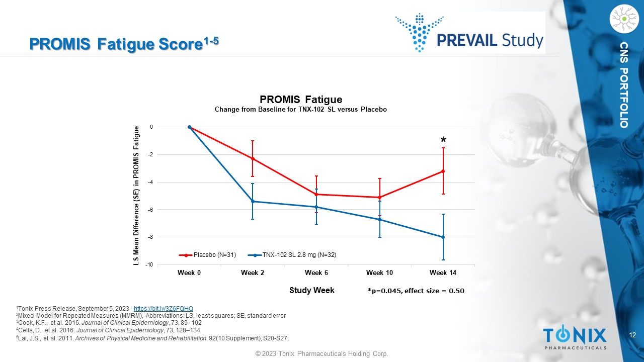 11 © 2023 Tonix Pharmaceuticals Holding Corp. CNS PORTFOLIO PROMIS Sleep Disturbance 1,2 1 Tonix Press Release, September 5, 2023 - https://bit.ly/3Z6FQHQ 2 Mixed Model for Repeated Measures (MMRM), Abbreviations: LS, least squares; SE, standard error; SD, sleep disturbance -12 -10 -8 -6 -4 -2 0 Week 0 Week 2 Week 6 Week 10 Week 14 LS Mean Difference (SE) in PROMIS SD Study Week PROMIS Sleep Disturbance Change from Baseline for TNX - 102 SL versus Placebo Placebo (N=31) TNX-102 SL 2.8 mg (N=32) *p=0.028 *