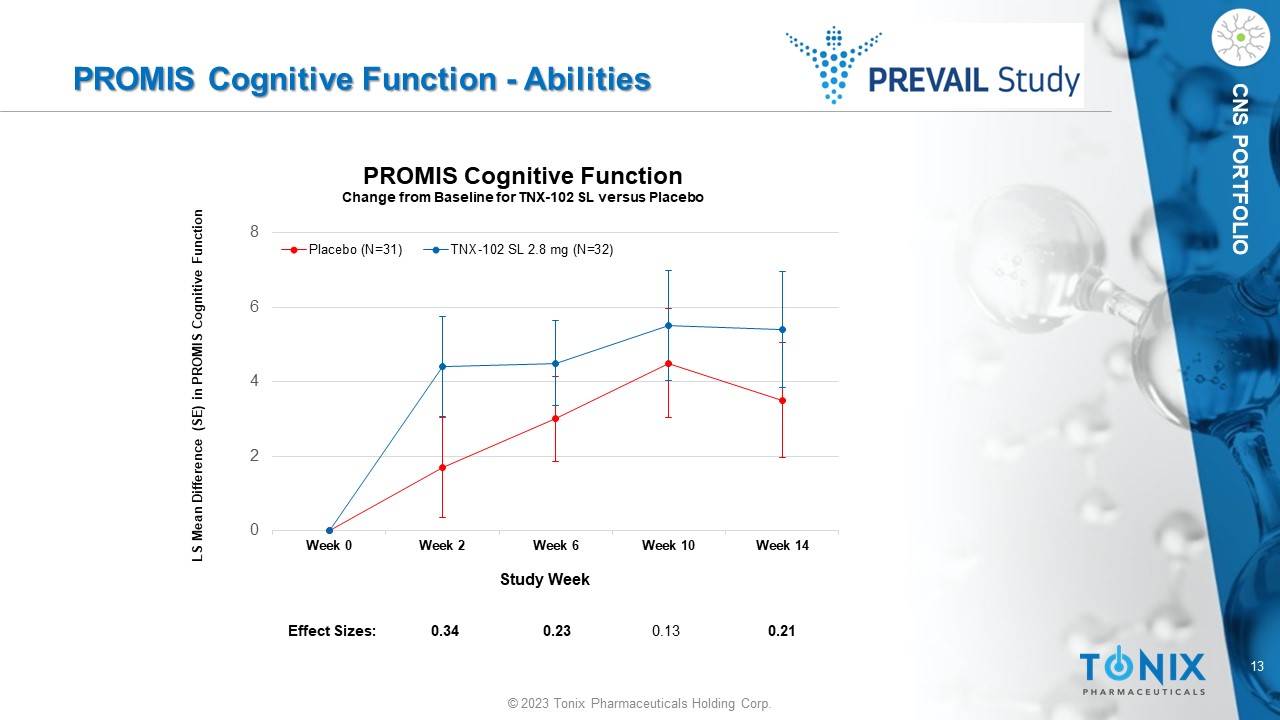 12 © 2023 Tonix Pharmaceuticals Holding Corp. CNS PORTFOLIO PROMIS Fatigue Score 1 - 5 1 Tonix Press Release, September 5, 2023 - https://bit.ly/3Z6FQHQ 2 Mixed Model for Repeated Measures (MMRM), Abbreviations: LS, least squares; SE, standard error 3 Cook, K.F., et al. 2016. Journal of Clinical Epidemiology , 73, 89 - 102 4 Cella, D., et al. 2016. Journal of Clinical Epidemiology , 73, 128 – 134 5 Lai, J.S., et al. 2011. Archives of Physical Medicine and Rehabilitation , 92(10 Supplement), S20 - S27 . -10 -8 -6 -4 -2 0 Week 0 Week 2 Week 6 Week 10 Week 14 LS Mean Difference (SE) in PROMIS Fatigue Study Week PROMIS Fatigue Change from Baseline for TNX - 102 SL versus Placebo Placebo (N=31) TNX-102 SL 2.8 mg (N=32) * *p=0.045, effect size = 0.50