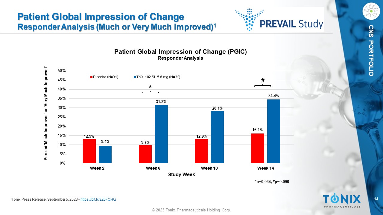 13 © 2023 Tonix Pharmaceuticals Holding Corp. CNS PORTFOLIO PROMIS Cognitive Function - Abilities 0 2 4 6 8 Week 0 Week 2 Week 6 Week 10 Week 14 LS Mean Difference (SE) in PROMIS Cognitive Function Study Week PROMIS Cognitive Function Change from Baseline for TNX - 102 SL versus Placebo Placebo (N=31) TNX-102 SL 2.8 mg (N=32) Effect Sizes: 0.34 0.23 0.13 0.21