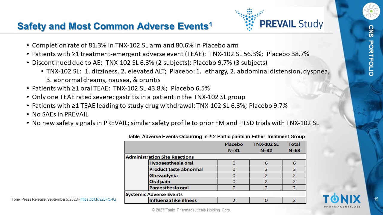 14 © 2023 Tonix Pharmaceuticals Holding Corp. CNS PORTFOLIO Patient Global Impression of Change Responder Analysis ( Much or Very Much Improved) 1 1 Tonix Press Release, September 5, 2023 - https://bit.ly/3Z6FQHQ 12.9% 9.7% 12.9% 16.1% 9.4% 31.3% 28.1% 34.4% 0% 5% 10% 15% 20% 25% 30% 35% 40% 45% 50% Week 2 Week 6 Week 10 Week 14 Study Week Patient Global Impression of Change (PGIC) Responder Analysis Placebo (N=31) TNX-102 SL 5.6 mg (N=32) Percent 'Much Improved' or 'Very Much Improved' * # *p=0.034, # p= 0.096