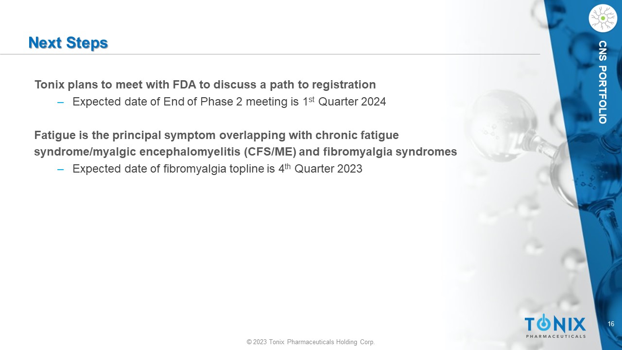 15 © 2023 Tonix Pharmaceuticals Holding Corp. CNS PORTFOLIO Safety and Most Common Adverse Events 1 1 Tonix Press Release, September 5, 2023 - https://bit.ly/3Z6FQHQ Placebo TNX-102 SL Total N=31 N=32 N=63 Administration Site Reactions Hypoaesthesia oral 0 6 6 Product taste abnormal 0 3 3 Glossodynia 0 2 2 Oral pain 0 2 2 Paraesthesia oral 0 2 2 Systemic Adverse Events Influenza like illness 2 0 2 Table. Adverse Events Occurring in ≥ 2 Participants in Either Treatment Group • Completion rate of 81.3% in TNX - 102 SL arm and 80.6% in Placebo arm • Patients with ≥1 treatment - emergent adverse event (TEAE): TNX - 102 SL 56.3%; Placebo 38.7% • Discontinued due to AE: TNX - 102 SL 6.3% (2 subjects); Placebo 9.7% (3 subjects) • TNX - 102 SL: 1. dizziness, 2. elevated ALT; Placebo: 1. lethargy, 2. abdominal distension, dyspnea, 3. abnormal dreams, nausea, & pruritis • Patients with ≥1 oral TEAE: TNX - 102 SL 43.8%; Placebo 6.5% • Only one TEAE rated severe: gastritis in a patient in the TNX - 102 SL group • Patients with ≥1 TEAE leading to study drug withdrawal: TNX - 102 SL 6.3%; Placebo 9.7% • No SAEs in PREVAIL • No new safety signals in PREVAIL; similar safety profile to prior FM and PTSD trials with TNX - 102 SL