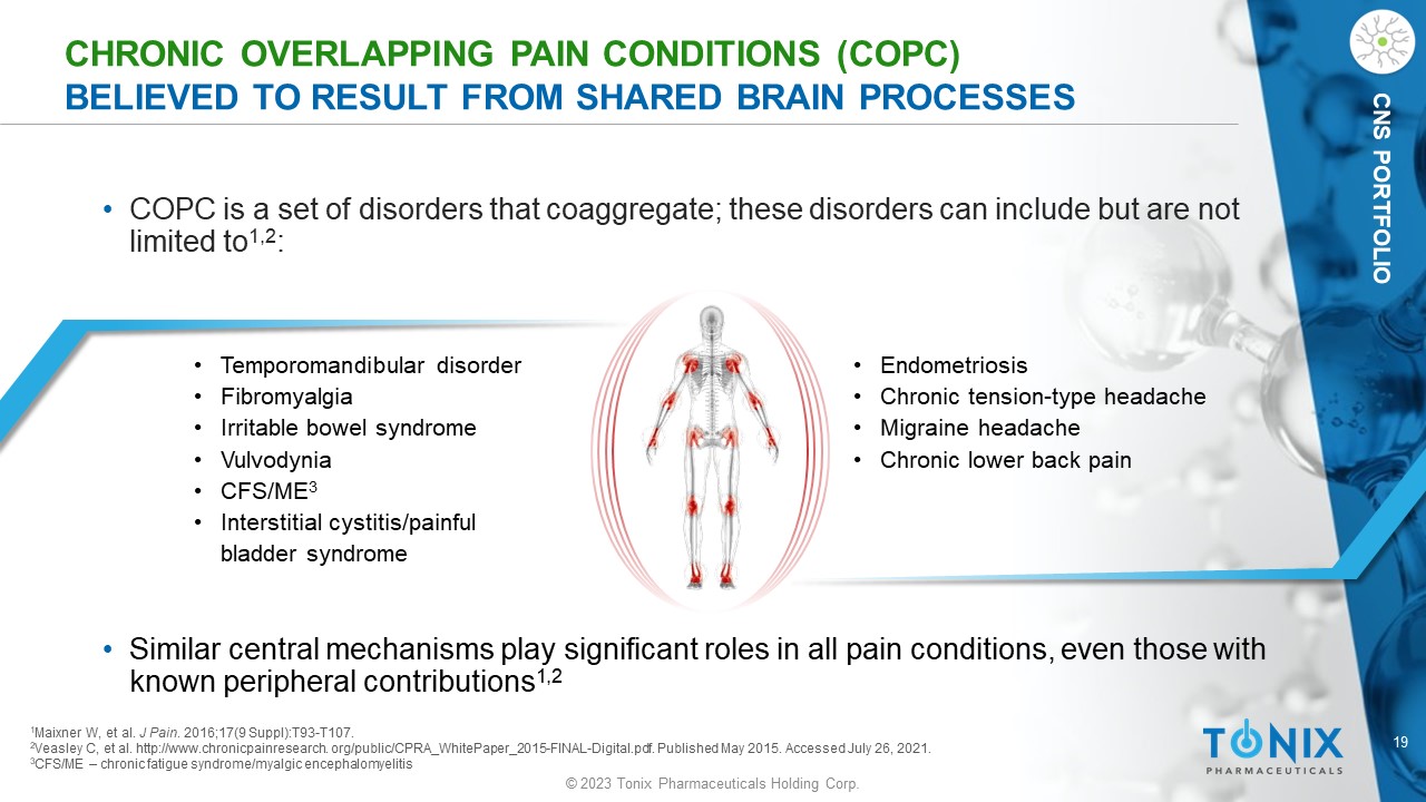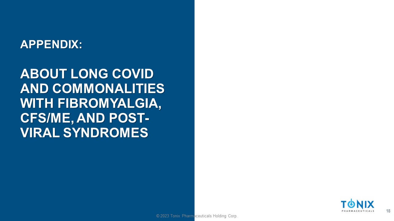 © 2023 Tonix Pharmaceuticals Holding Corp. APPENDIX: ABOUT LONG COVID AND COMMONALITIES WITH FIBROMYALGIA, CFS/ME, AND POST - VIRAL SYNDROMES 18