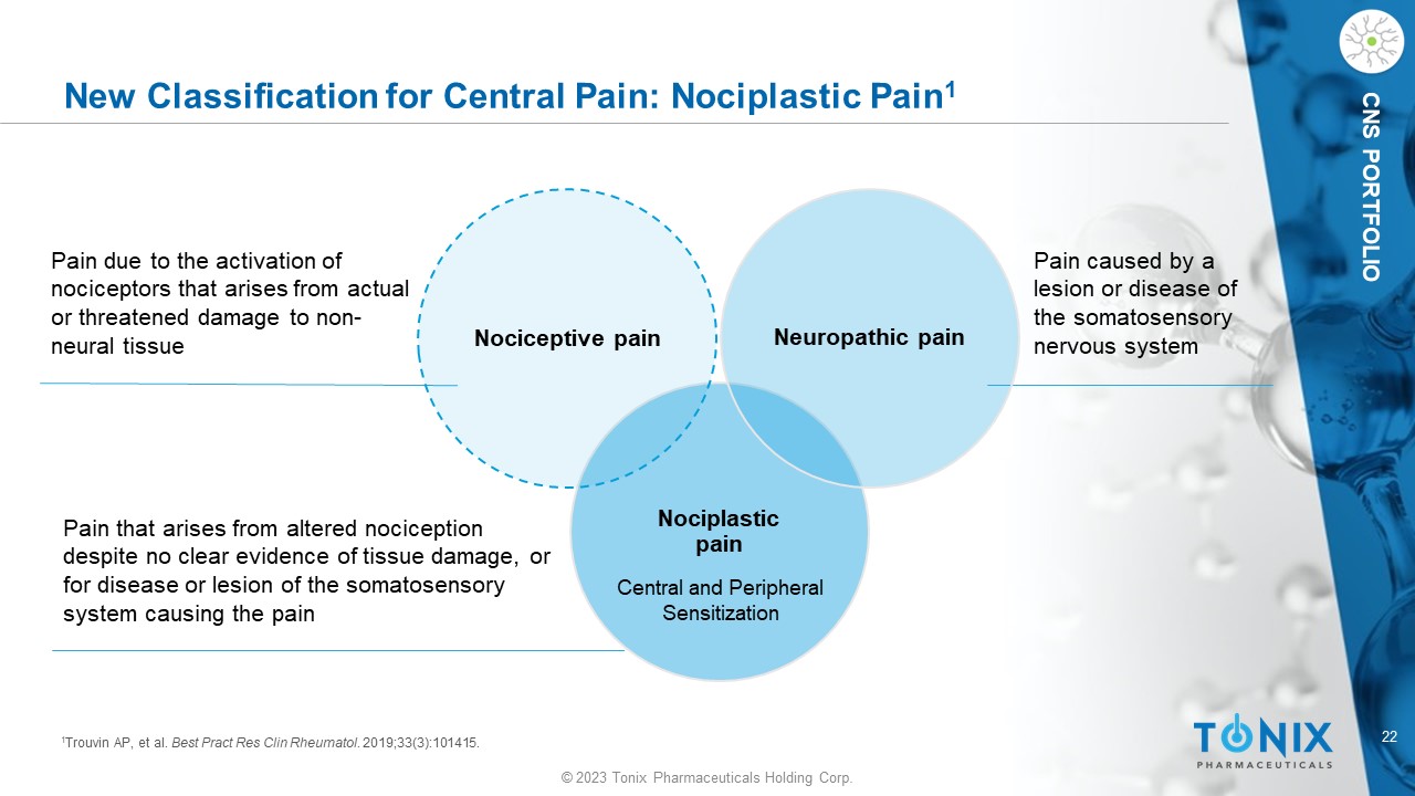 21 © 2023 Tonix Pharmaceuticals Holding Corp. CNS PORTFOLIO POTENTIAL INCREASE IN MYALGIA FOLLOWING THE COVID - 19 PANDEMIC The specific causes may be due to: Chronic pain increase due to COVID - 19 could be nociplastic , neuropathic, or nociceptive Chronic pain newly triggered in individuals without SARS - CoV - 2 infection by exacerbation of risk factors (poor sleep, inactivity, fear, anxiety, and depression) Chronic pain as part of a post viral syndrome or the result of viral - associated organ damage Worsening of chronic pain due to exacerbation of preexisting pain physical or mental complaints Clauw DJ et al. Pain. 2020;161(8):1694 - 1697.