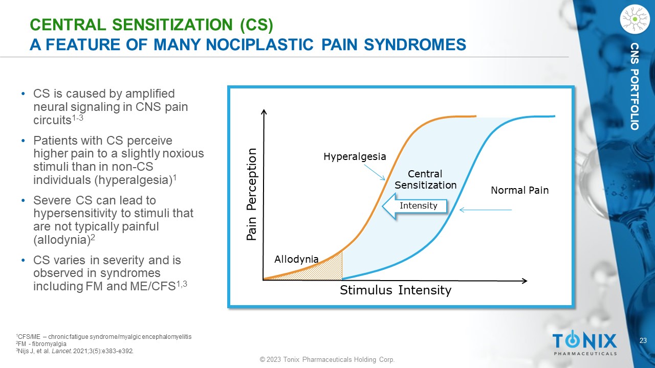 22 © 2023 Tonix Pharmaceuticals Holding Corp. CNS PORTFOLIO New Classification for Central Pain: Nociplastic Pain 1 Nociplastic pain Nociceptive pain Neuropathic pain Pain due to the activation of nociceptors that arises from actual or threatened damage to non - neural tissue Pain that arises from altered nociception despite no clear evidence of tissue damage, or for disease or lesion of the somatosensory system causing the pain Pain caused by a lesion or disease of the somatosensory nervous system 1 Trouvin AP, et al. Best Pract Res Clin Rheumatol . 2019;33(3):101415. Central and Peripheral Sensitization