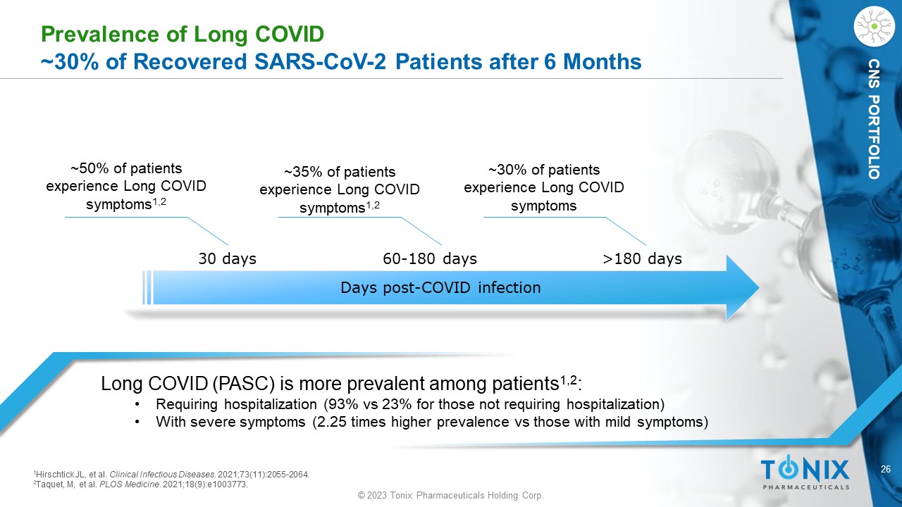 25 © 2023 Tonix Pharmaceuticals Holding Corp. CNS PORTFOLIO Timeline of Long COVID After Acute COVID - 19 Post - Viral Syndrome 1 - 3 Week - 2 Week - 1 Week 1 Week 2 Week 3 Week 4 6 months Detection unlikely PCR positive PCR negative Acute COVID - 19 Long COVID Viral load Nasopharyngeal Respiratory tract • Chest pain • Palpitations • Thromboembolism • Dyspnea • Cough • Persistent O 2 requirement • Anxiety/depression • Sleep problems • Headaches • Brain fog • Fatigue • Chronic kidney disease • Muscle weakness • Joint pain 1 Hirschtick JL, et al. Clinical Infectious Diseases . 2021;73(11):2055 - 2064. 2 Taquet, M, et al. PLOS Medicine . 2021;18(9):e1003773. 3 Sørensen, AL, et al. medRxiv . 2022:2022.2002.2027.22271328.