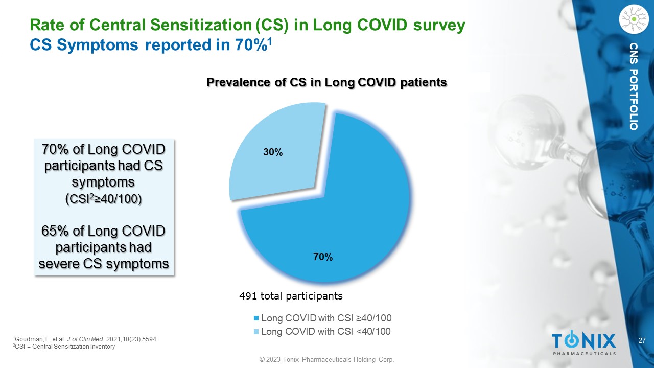 26 © 2023 Tonix Pharmaceuticals Holding Corp. CNS PORTFOLIO Prevalence of Long COVID ~30% of Recovered SARS - CoV - 2 Patients after 6 Months Long COVID (PASC) is more prevalent among patients 1,2 : • Requiring hospitalization (93% vs 23% for those not requiring hospitalization) • With severe symptoms (2.25 times higher prevalence vs those with mild symptoms) ~50% of patients experience L ong COVID symptoms 1,2 Days post - COVID infection 30 days 60 - 180 days >180 days ~35% of patients experience Long COVID symptoms 1,2 ~30% of patients experience Long COVID symptoms 1 Hirschtick JL, et al. Clinical Infectious Diseases . 2021;73(11):2055 - 2064. 2 Taquet, M, et al. PLOS Medicine . 2021;18(9):e1003773.
