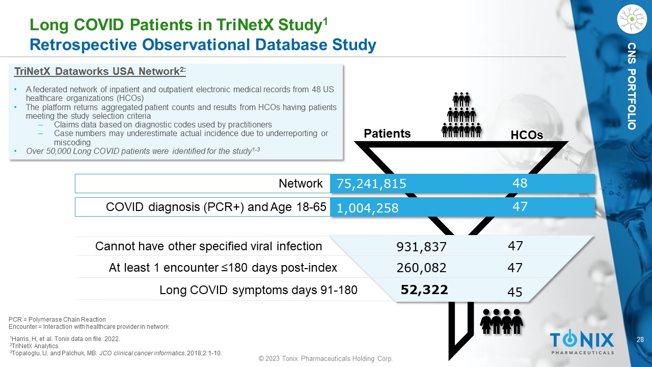 27 © 2023 Tonix Pharmaceuticals Holding Corp. CNS PORTFOLIO Rate of Central Sensitization (CS) in Long COVID survey CS Symptoms reported in 70% 1 70% 30% Long COVID with CSI ≥40/100 Long COVID with CSI <40/100 491 total participants 1 Goudman , L, et al. J of Clin Med . 2021;10(23):5594. 2 CSI = Central Sensitization Inventory 70% of Long COVID participants had CS symptoms ( CSI 2 ≥40/100) 65% of Long COVID participants had severe CS symptoms Prevalence of CS in Long COVID patients