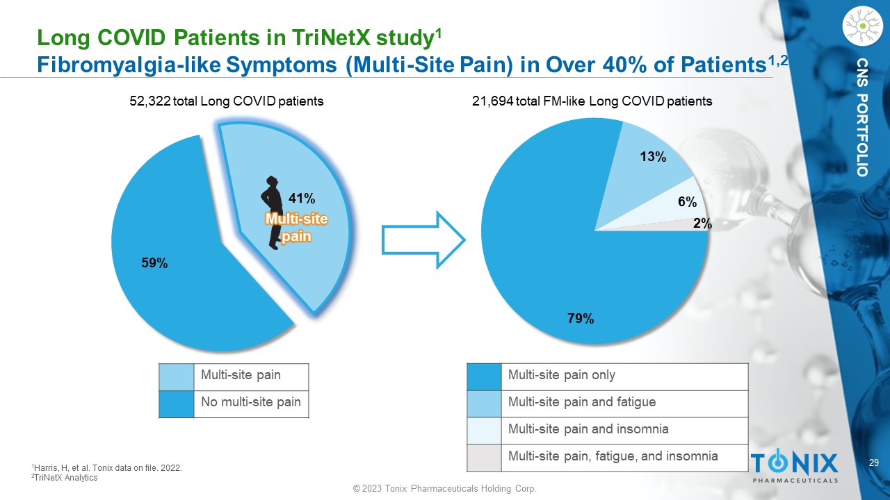 28 © 2023 Tonix Pharmaceuticals Holding Corp. CNS PORTFOLIO Long COVID Patients in TriNetX Study 1 Retrospective Observational Database Study 1 Harris, H, et al. Tonix data on file. 2022. 2 TriNetX Analytics 3 Topaloglu, U, and Palchuk , MB. JCO clinical cancer informatics . 2018;2:1 - 10. TriNetX Dataworks USA Network 2: • A federated network of inpatient and outpatient electronic medical records from 48 US healthcare organizations (HCOs) • The platform returns aggregated patient counts and results from HCOs having patients meeting the study selection criteria ‒ Claims data based on diagnostic codes used by practitioners ‒ Case numbers may underestimate actual incidence due to underreporting or miscoding • Over 50,000 Long COVID patients were identified for the study 1 - 3 52,322 260,082 931,837 47 47 45 48 47 75,241,815 1,004,258 HCOs Patients Network COVID diagnosis (PCR+) and Age 18 - 65 Cannot have other specified viral infection At least 1 encounter ≤180 days post - index Long COVID symptoms days 91 - 180 PCR = Polymerase Chain Reaction Encounter = Interaction with healthcare provider in network