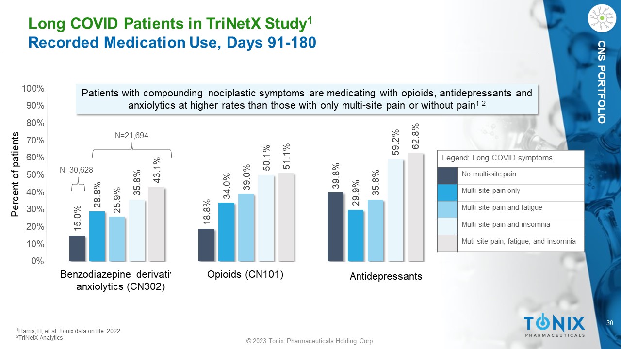29 © 2023 Tonix Pharmaceuticals Holding Corp. CNS PORTFOLIO L ong COVID P atients in T riNetX study 1 F ibromyalgia - like Symptoms (Multi - Site Pain) in Over 40% of Patients 1,2 79% 13% 6% 2% 52,322 total Long COVID patients 21,694 total FM - like Long COVID patients 1 Harris, H, et al. Tonix data on file. 2022. 2 TriNetX Analytics 59% 41% Multi - site pain Multi - site pain No multi - site pain Multi - site pain only Multi - site pain and fatigue Multi - site pain and insomnia Multi - site pain, fatigue, and insomnia