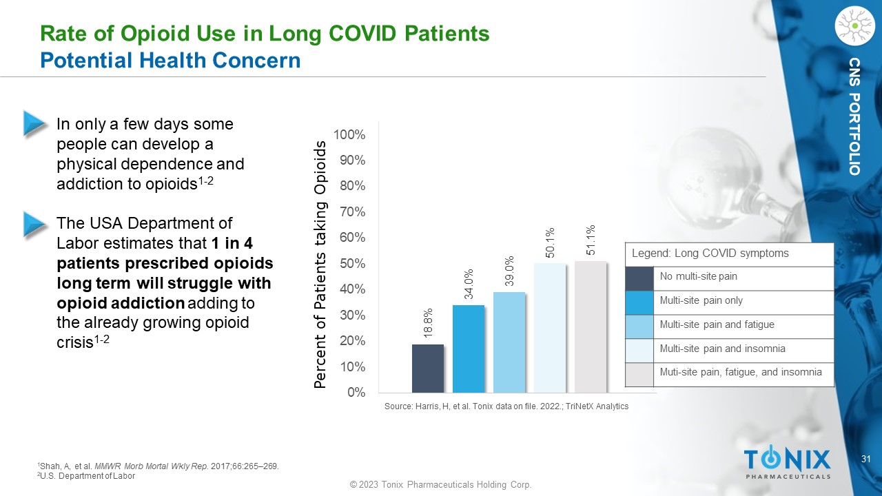 30 © 2023 Tonix Pharmaceuticals Holding Corp. CNS PORTFOLIO L ong COVID Patients in TriNetX Study 1 Recorded Medication Use, Days 91 - 180 15.0% 18.8% 39.8% 28.8% 34.0% 29.9% 25.9% 39.0% 35.8% 35.8% 50.1% 59.2% 43.1% 51.1% 62.8% 0% 10% 20% 30% 40% 50% 60% 70% 80% 90% 100% Patients with compounding nociplastic symptoms are medicating with opioids, antidepressants and anxiolytics at higher rates than those with only multi - site pain or without pain 1 - 2 1 Harris, H, et al. Tonix dat a on file. 2022. 2 TriNetX Analytics Percent of patients Benzodiazepine derivative anxiolytics (CN302) Opioids (CN101) Antidepressants Legend: Long COVID symptoms No multi - site pain Multi - site pain only Multi - site pain and fatigue Multi - site pain and insomnia Muti - site pain, fatigue, and insomnia N=21,694 N=30,628