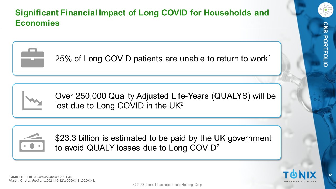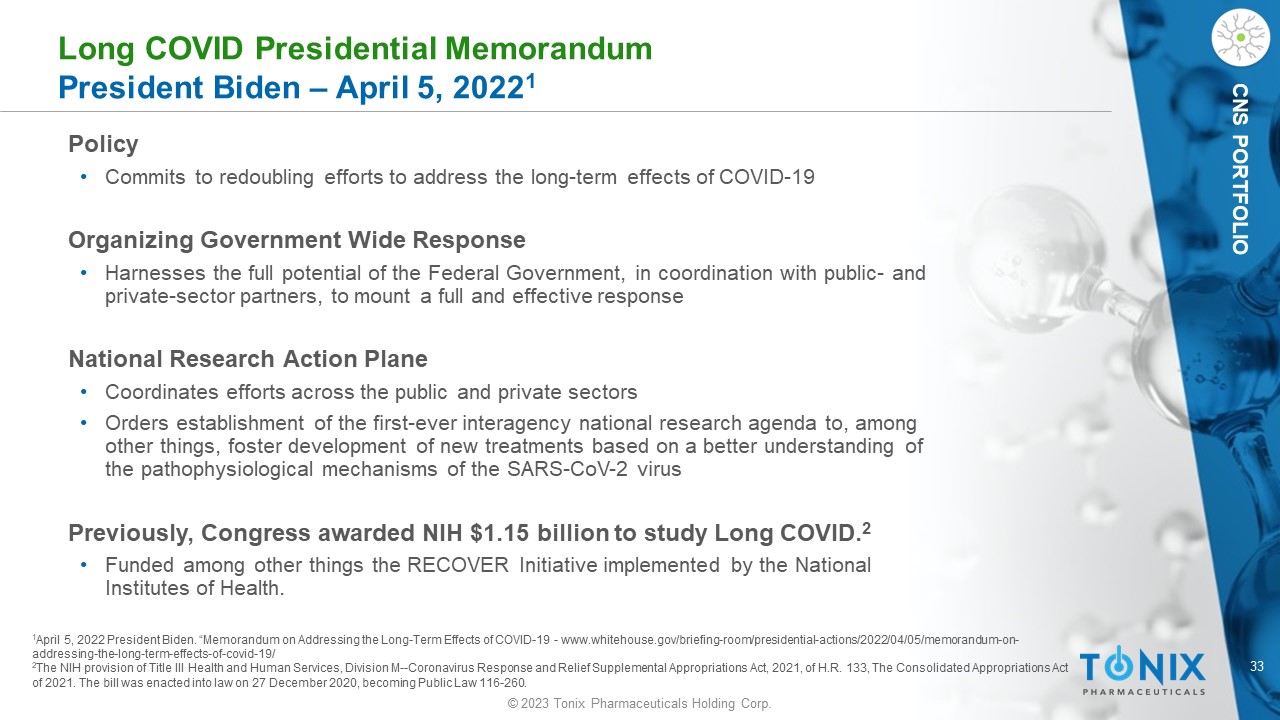 32 © 2023 Tonix Pharmaceuticals Holding Corp. CNS PORTFOLIO Significant Financial Impact of Long COVID for Households and Economies 25% of Long COVID patients are unable to return to work 1 Over 250,000 Quality Adjusted Life - Years (QUALYS) will be lost due to Long COVID in the UK 2 $23.3 billion is estimated to be paid by the UK government to avoid QUALY losses due to Long COVID 2 1 Davis, HE, et al. eClinicalMedicine . 2021;38. 2 Martin, C, et al. PloS one . 2021;16(12):e0260843 - e0260843.