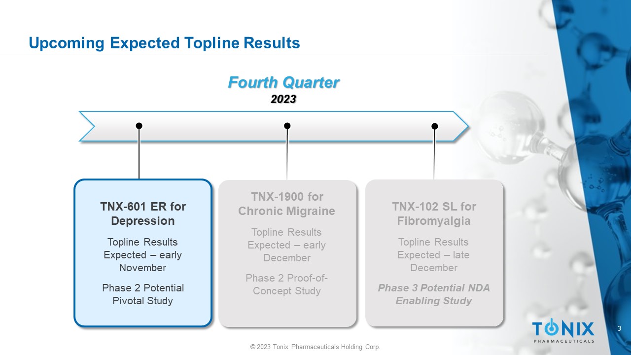 © 2023 Tonix Pharmaceuticals Holding Corp. 2 © 2023 Tonix Pharmaceuticals Holding Corp. Cautionary Note on Forward - Looking Statements Certain statements in this presentation regarding strategic plans, expectations and objectives for future operations or results are “forward - looking statements” as defined by the Private Securities Litigation Reform Act of 1995. These statements may be identified by the use of forward - looking words such as “anticipate,” “believe,” “forecast,” “estimate” and “intend,” among others. These forward - looking statements are based on Tonix’s current expectations and actual results could differ materially. There are a number of factors that could cause actual events to differ materially from those indicated by such forward - looking statements. These factors include, but are not limited to, the risks related to failure to obtain FDA clearances or approvals and noncompliance with FDA regulations; delays and uncertainties caused by the global COVID - 19 pandemic; risks related to the timing and progress of clinical development of our product candidates; our need for additional financing; uncertainties of patent protection and litigation; uncertainties of government or third party payor reimbursement; limited research and development efforts and dependence upon third parties; and substantial competition. As with any pharmaceutical under development, there are significant risks in the development, regulatory approval and commercialization of new products. The forward - looking statements in this presentation are made as of the date of this presentation, even if subsequently made available by Tonix on its website or otherwise. Tonix does not undertake an obligation to update or revise any forward - looking statement, except as required by law. Investors should read the risk factors set forth in the Annual Report on Form 10 - K for the year ended December 31, 2022, as filed with the Securities and Exchange Commission (the “SEC”) on March 13, 2023, and periodic reports and current reports filed with the SEC on or after the date thereof. All of Tonix's forward - looking statements are expressly qualified by all such risk factors and other cautionary statements.