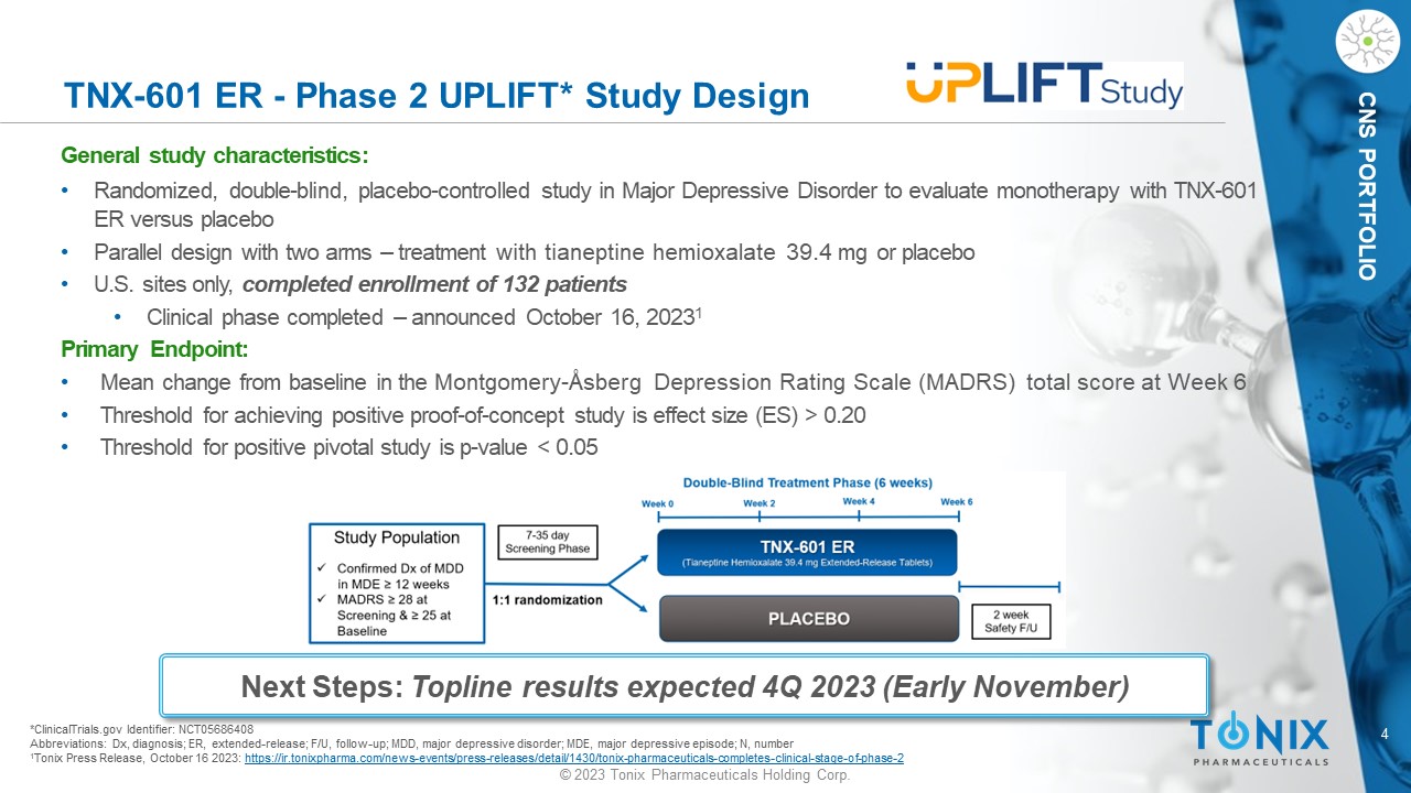 © 2023 Tonix Pharmaceuticals Holding Corp. 3 © 2023 Tonix Pharmaceuticals Holding Corp. Upcoming Expected Topline Results Fourth Quarter 2023 TNX - 1900 for Chronic Migraine Topline Results Expected – early December Phase 2 Proof - of - Concept Study TNX - 601 ER for Depression Topline Results Expected – early November Phase 2 Potential Pivotal Study TNX - 102 SL for Fibromyalgia Topline Results Expected – late December Phase 3 Potential NDA Enabling Study