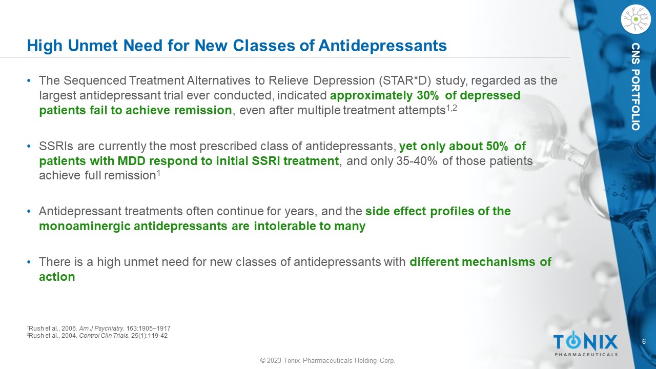 © 2023 Tonix Pharmaceuticals Holding Corp. 5 © 2023 Tonix Pharmaceuticals Holding Corp. CNS PORTFOLIO Major Depressive Disorder (MDD) • Major depressive disorder (MDD) is a leading cause of disability worldwide, with 21 million adults in the US alone experiencing a depressive episode in 2020 1 • L ifetime prevalence of 16%, and associated with important psychological suffering, as well as elevated rates of suicide and worse prognosis of comorbid medical conditions 2,3 • Highly comorbid with other psychiatric disorders (e.g., anxiety disorders, substance use disorders) as well as medical conditions (e.g., cardiovascular disease, metabolic syndromes, respiratory diseases, various deficiencies, infections, collagen disorders, endocrine diseases, etc.) • Hormonal aspects can significantly impact course and treatment (especially evident in post - partum depression) • Most treatment guidelines support use of antidepressants in moderate to severe MDD Epidemiology and Characteristics of Depression 1 Substance Abuse and Mental Health Services Administration (SAMHSA). 2020. Key Substance Use and Mental Health Indicators in t he United States: Results from the 2020 National Survey on Drug Use and Health. 2 Kupfer et al., 2012. The Lancet . 379, 1045 – 1055 3 Otte et al., 2016. Nat. Rev. Dis. Primer . 2:16065